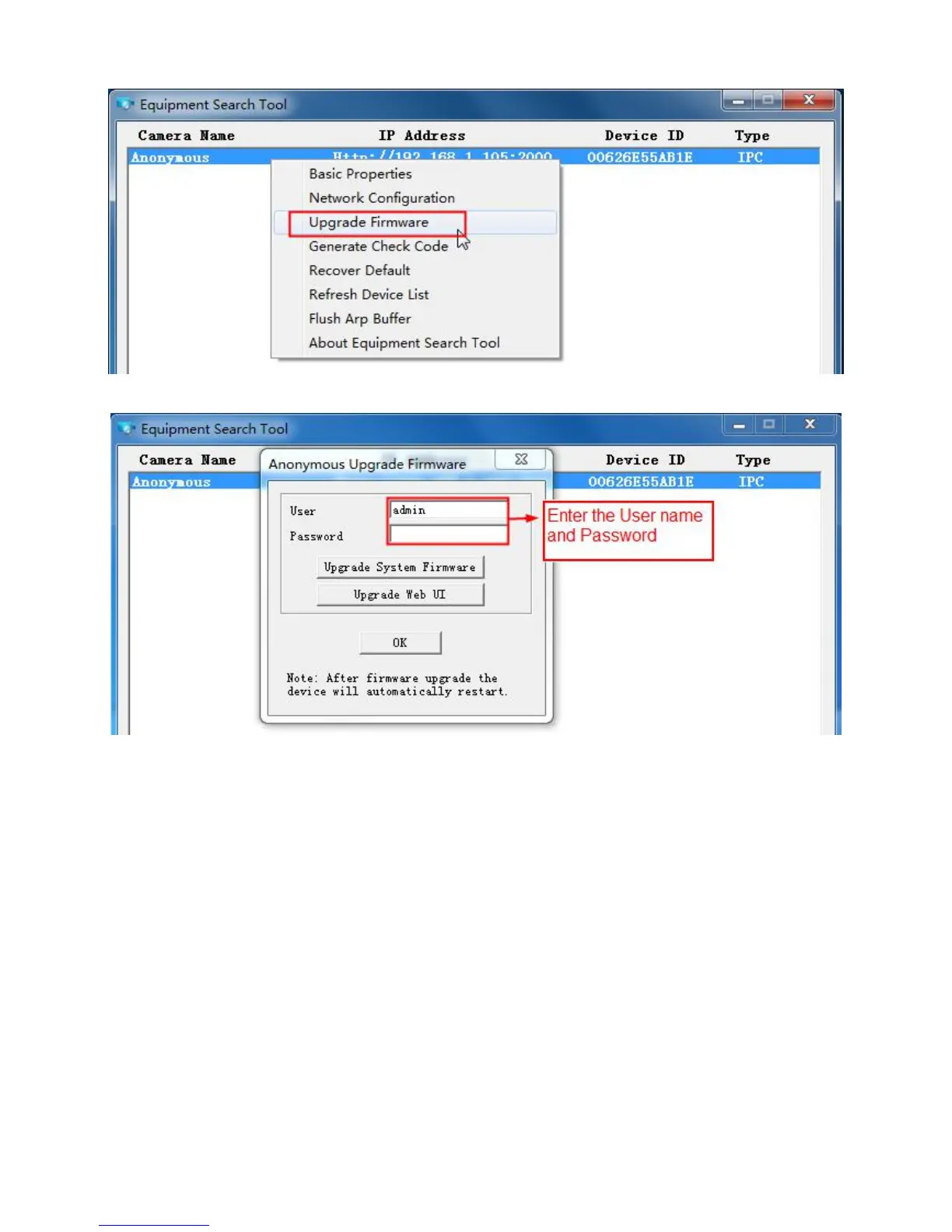 5) Never shut down the power of the camera during upgrade until the IP camera restart and get connected.