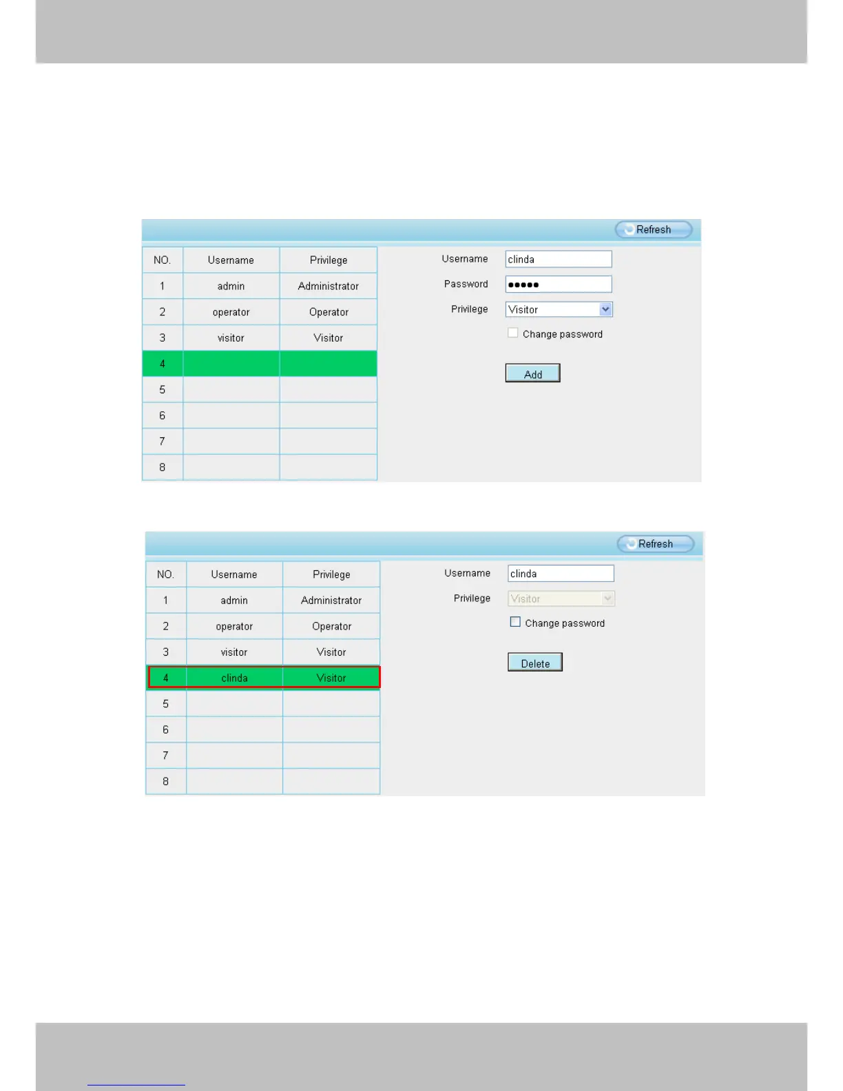 Delete Select the account which you want to delete, then click Delete button to take effect.