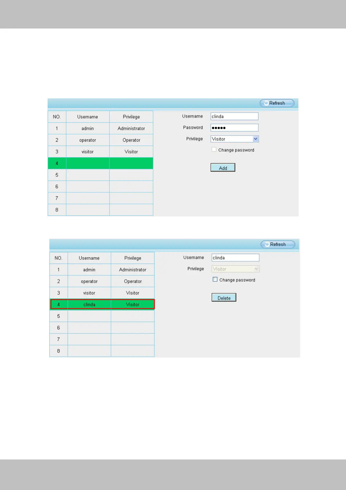 Delete Select the account which you want to delete, then click Delete button to take effect.