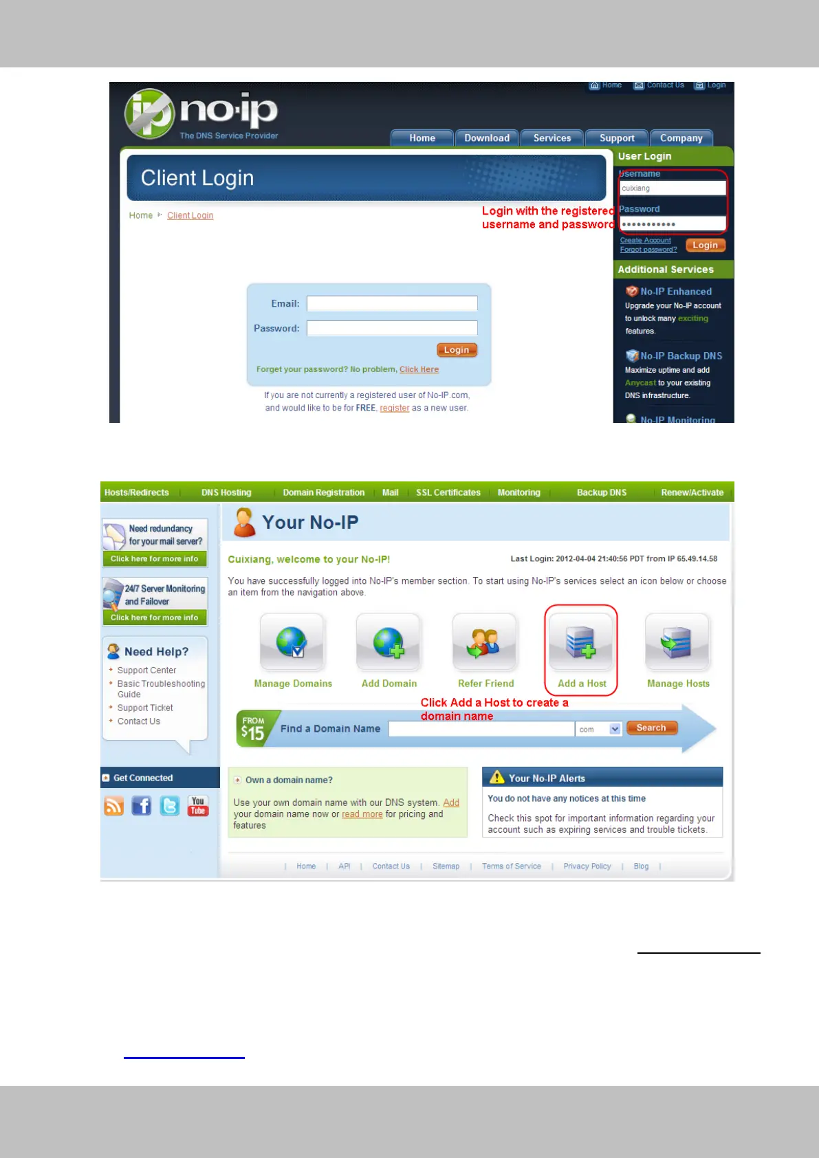 Please create the domain name step by step according to instructions on www.no-ip.com