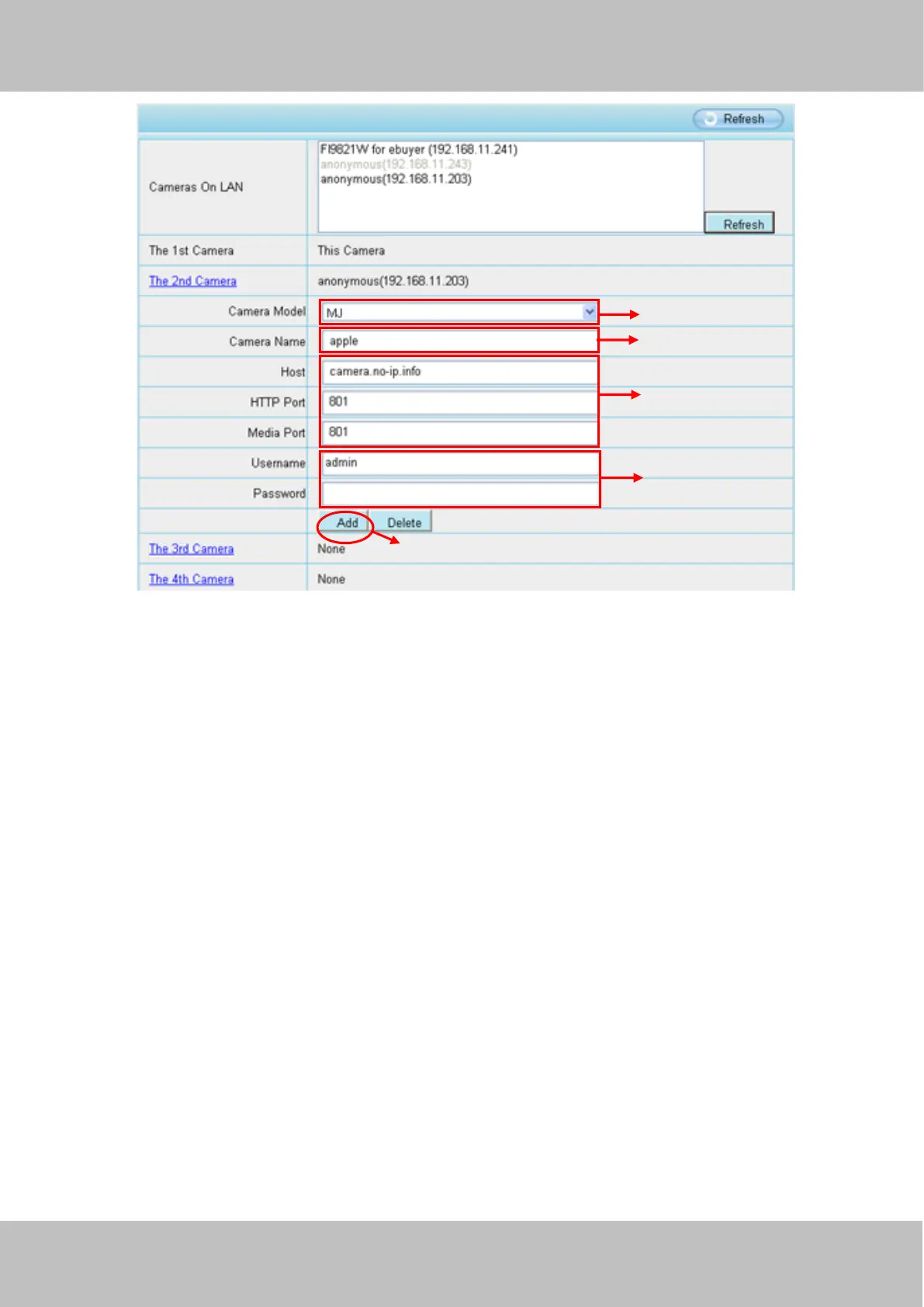 NOTE: Here the Host must be entered as the second camera’s DDNS domain name, not its LAN IP.