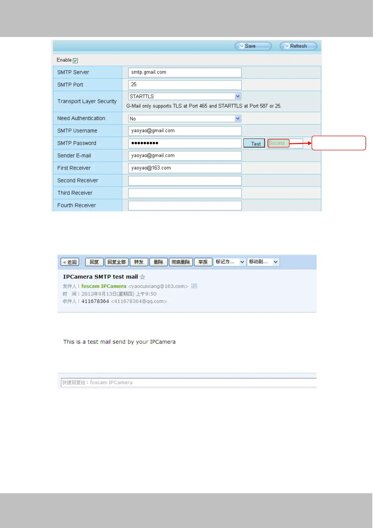 If the test success, you can see the Success behind the Test, at the same time the receivers will receive a test mail.