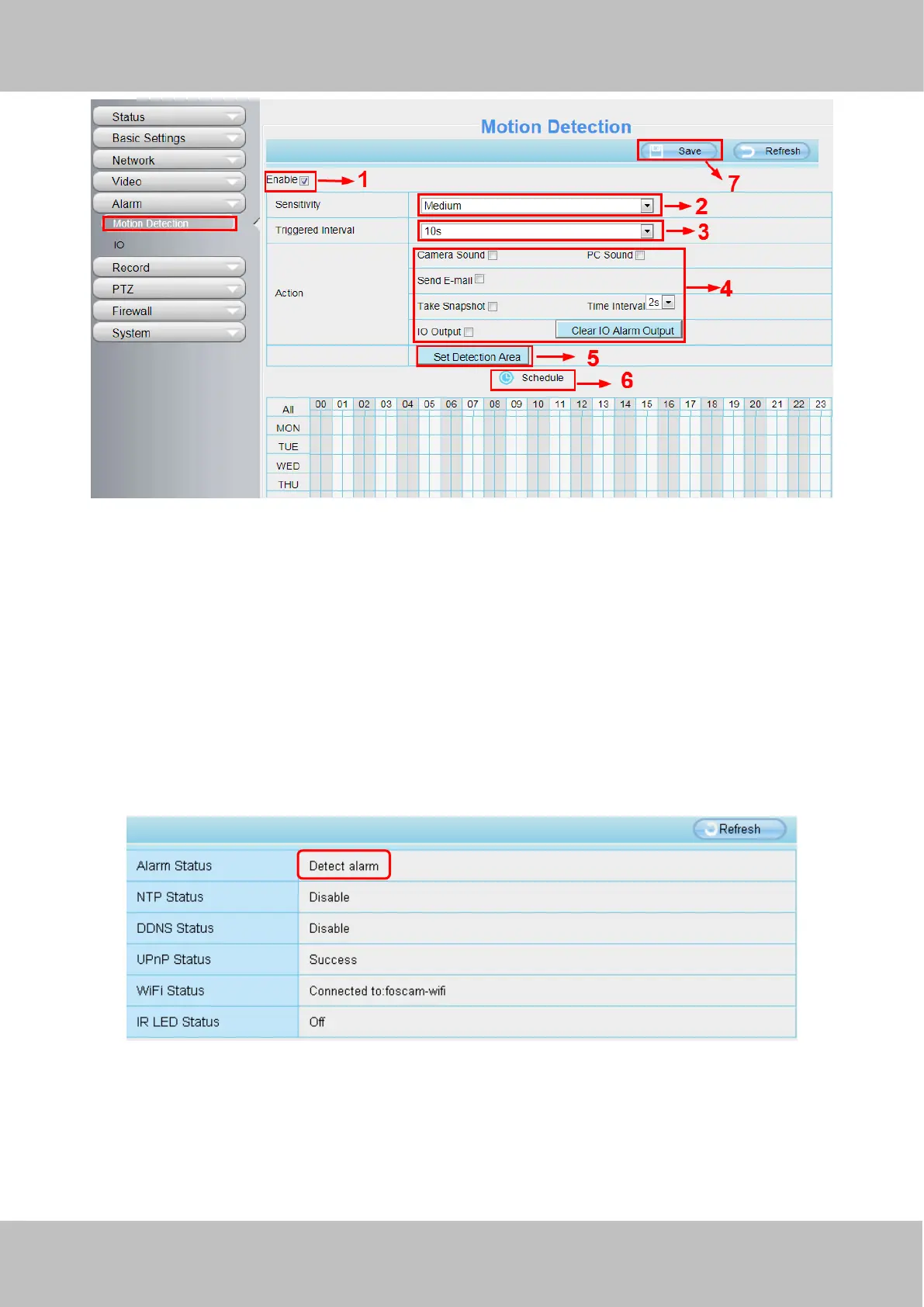 When the motion has been detected, the alarm status will turn to Detect alarm.
