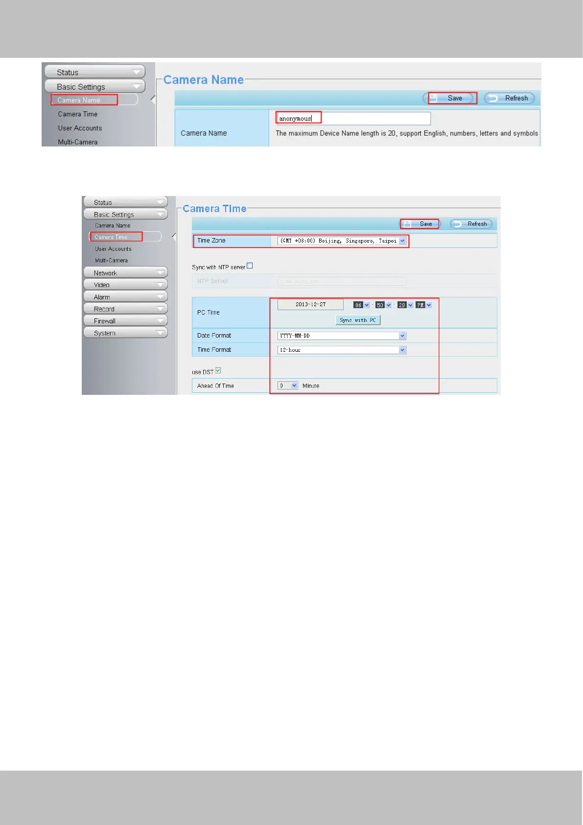2. Choose Basic Setting > Camera Time. The Camera Time page appears. Configure the parameters, as shown in