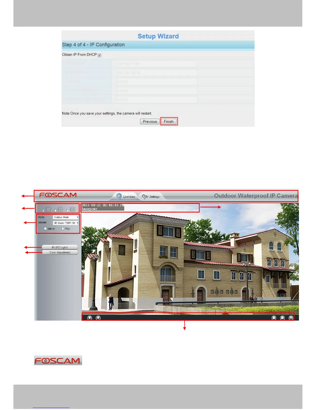 Section1 FOSCAM Logo/ Live Video / Settings buttons