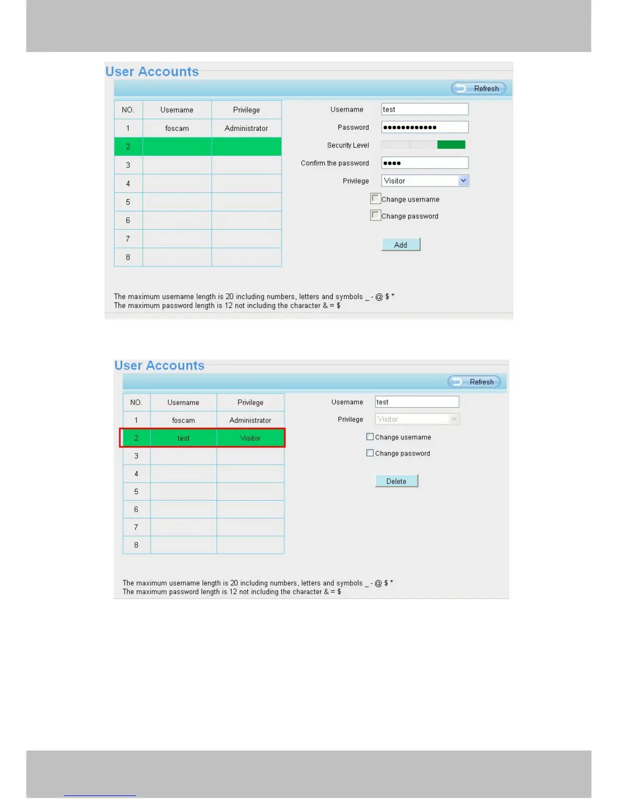 Delete: Select the account which you want to delete, then click Delete button to take effect.