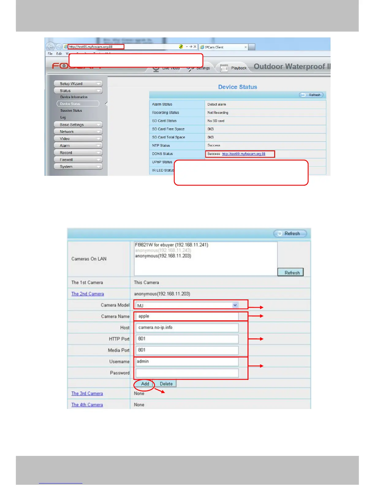 Click Multi-Device Settings. Choose The 2nd Device. Fill in the 2nd camera’s name, DDNS domain name,