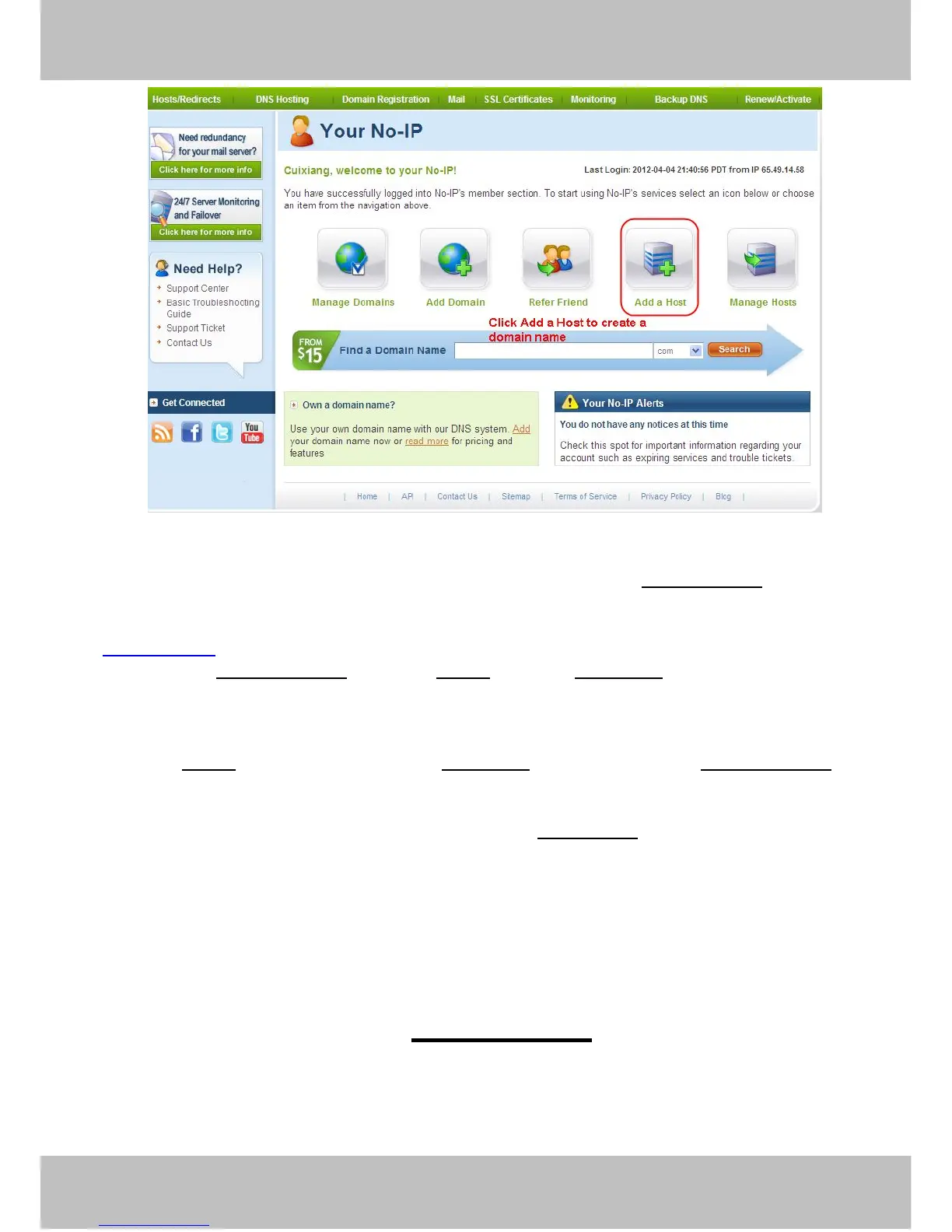 Please create the domain name step by step according to instructions on www.no-ip.com