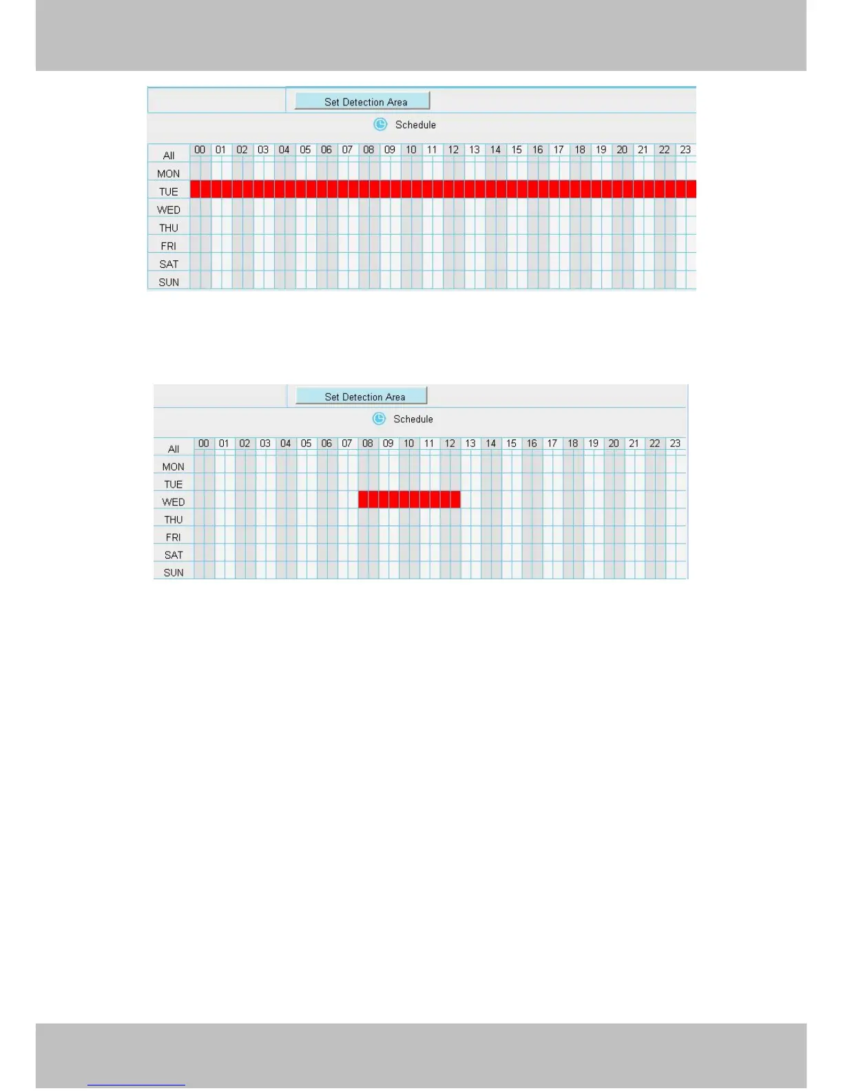 You must set the detection area and detection schedule, or else there is no alarm anywhere and anytime.