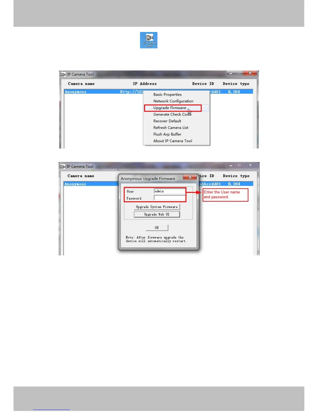 Double click the IP Camera Tool shot icon , select the Camera IP that you want to upgrade the