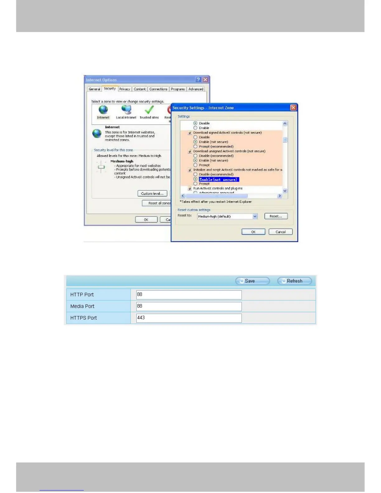 If you allow the ActiveX running, but still could not see living video. Please change another port number to try.