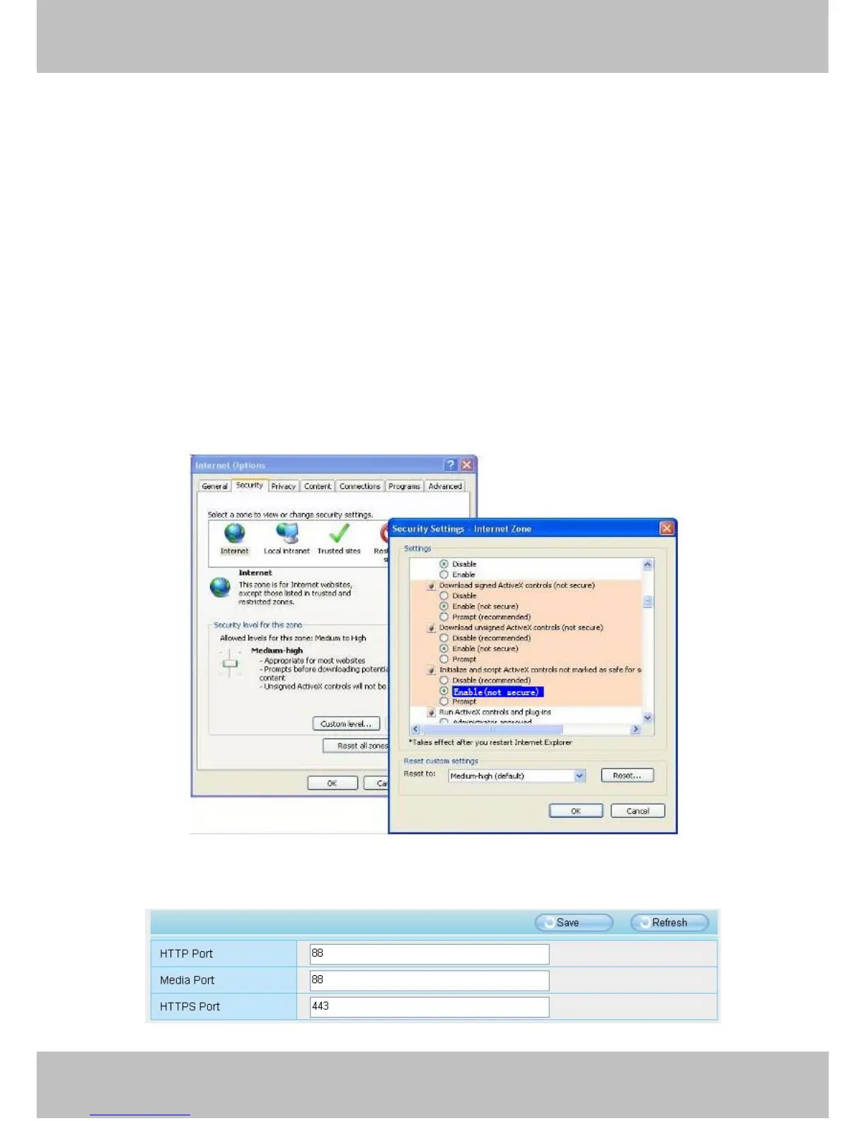 If you allow the ActiveX running, but still could not see living video. Please change another port number to try.