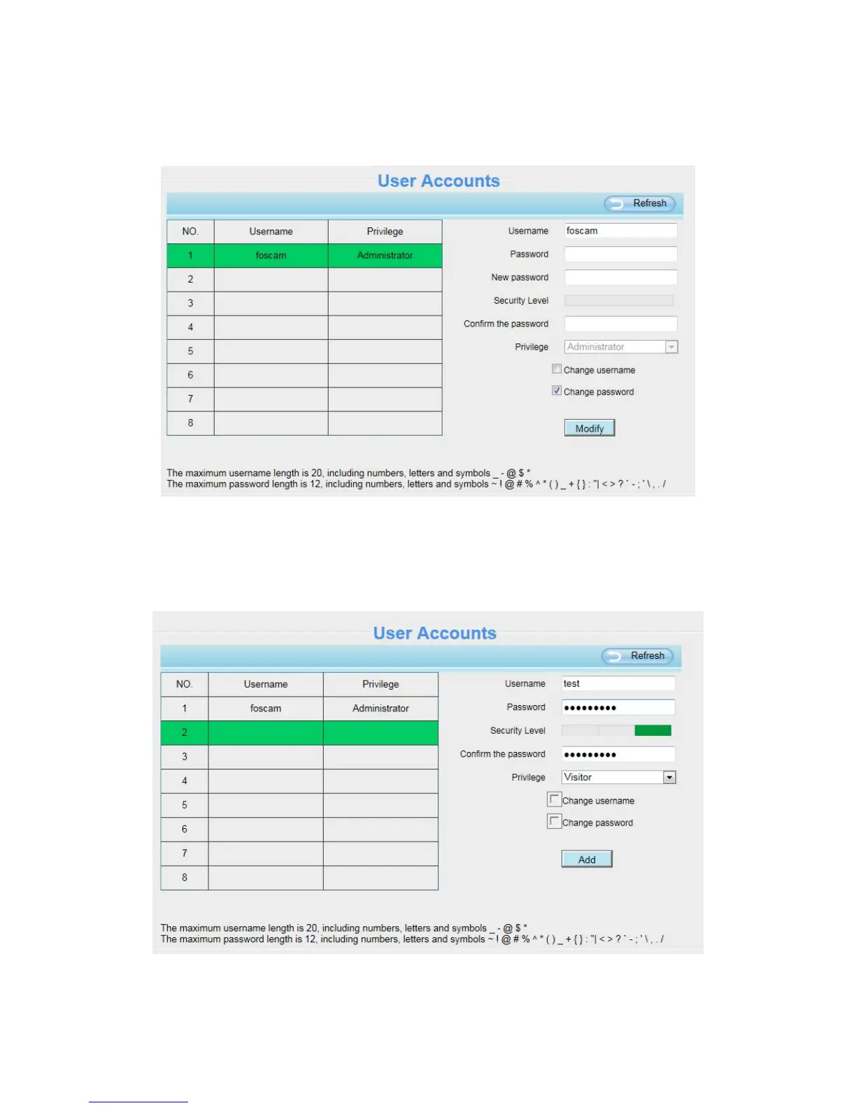 Select one blank column, then enter the new user name, password and privilege, last click Add to take effect.