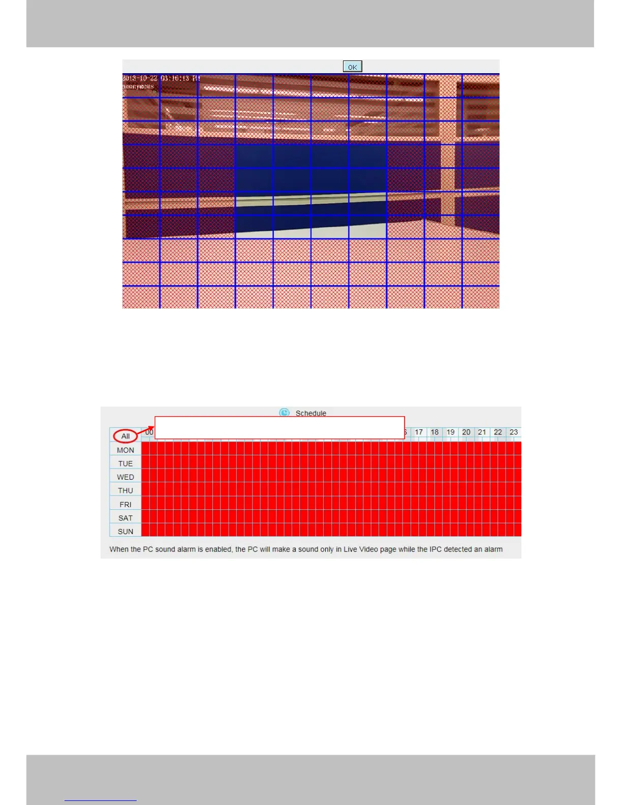 of TUE turns to red, that means during Tuesday whole day, when something moving in the detection area, the
