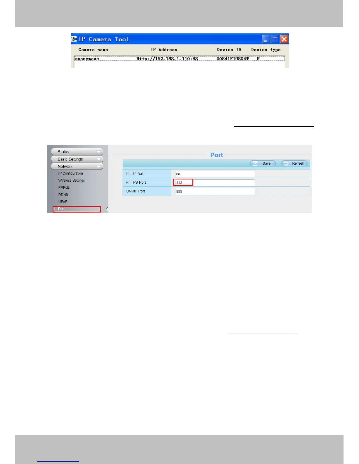 The default https port No. is 443. You can use the url to access the camera: https:// LAN IP + HTTPS port.