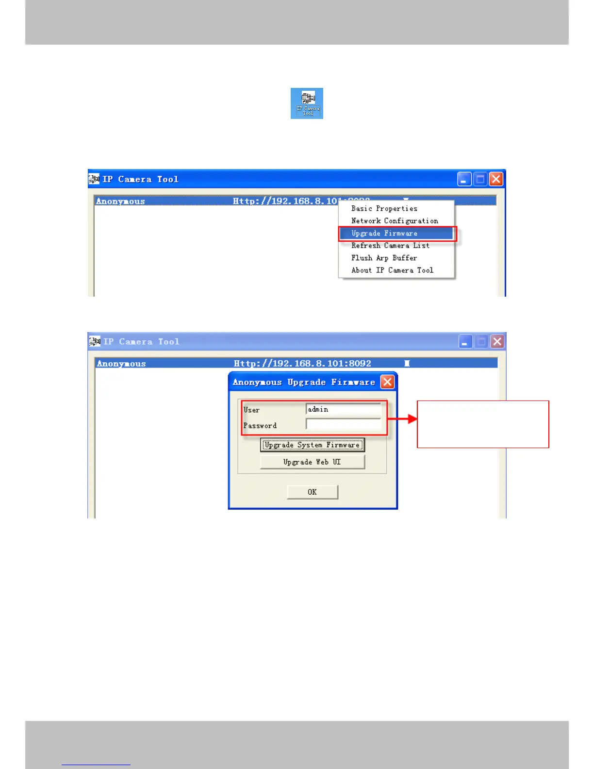 upgrade the firmware. Then select Upgrade Firmware and enter the username and password,
