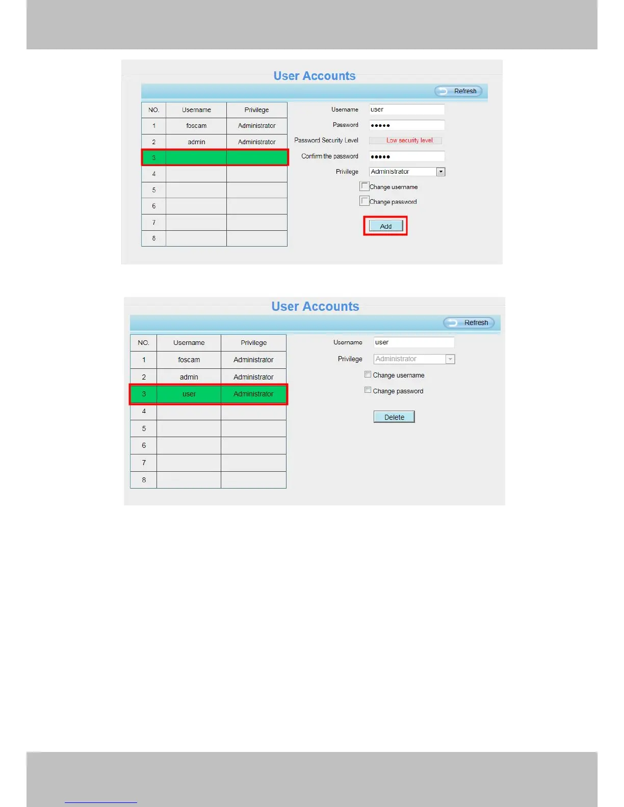 Delete :Select the account which you want to delete, then click Delete button to take effect.