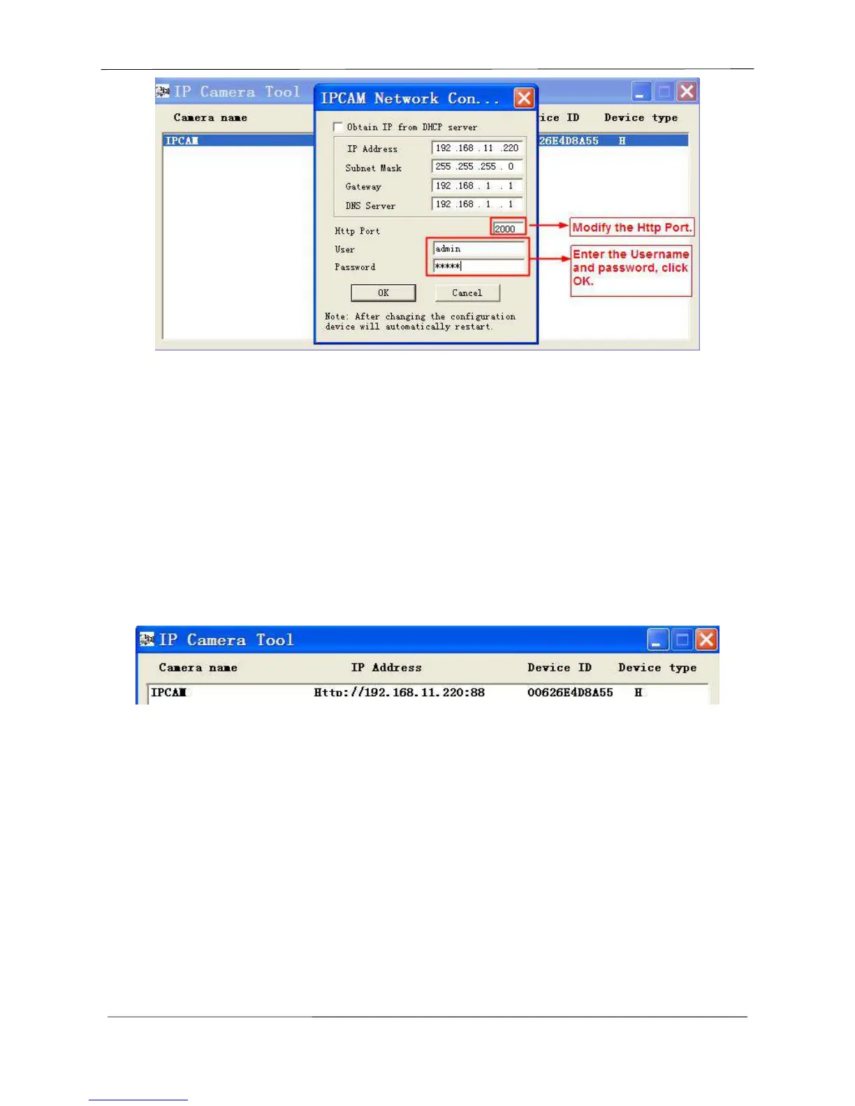 example it was changed to 2000, so we see http://192.168.8.102:2000 in IP Camera Tool. Also, the LAN