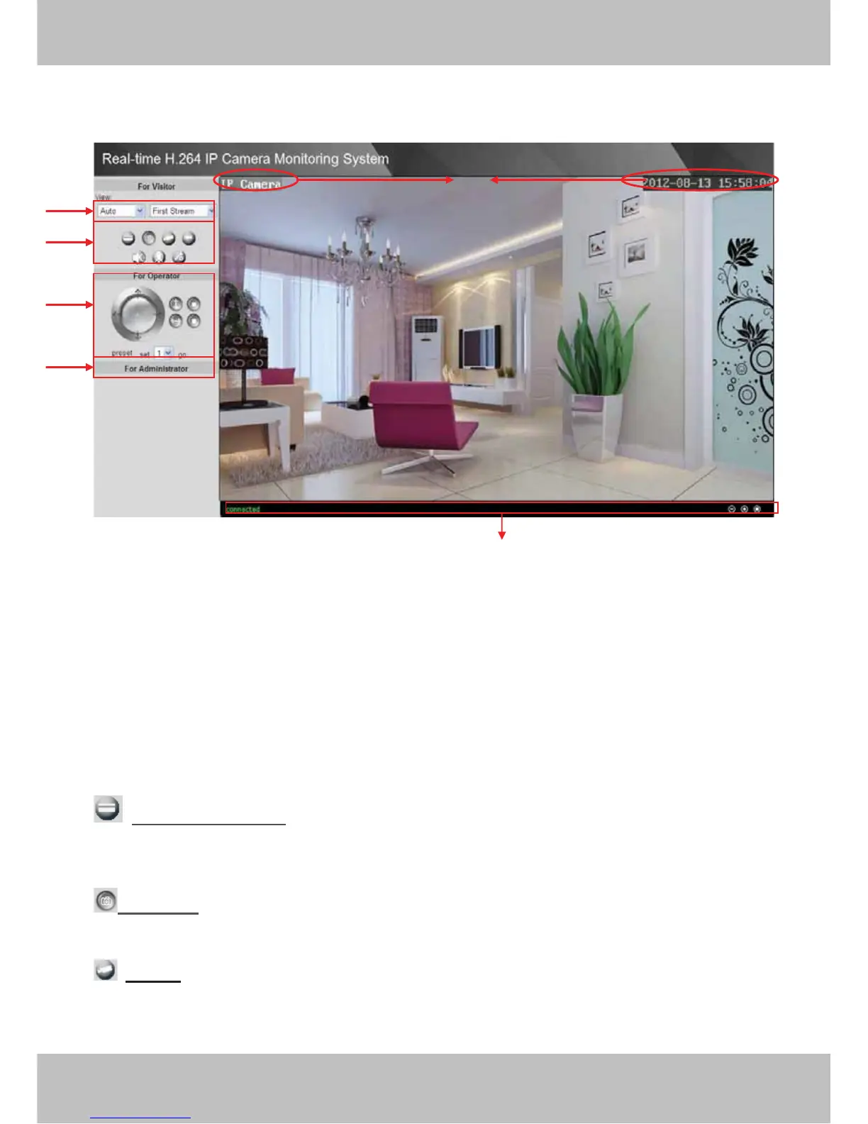 Snapshot: Click this icon, the camera will snap a picture and store it to a predetermined