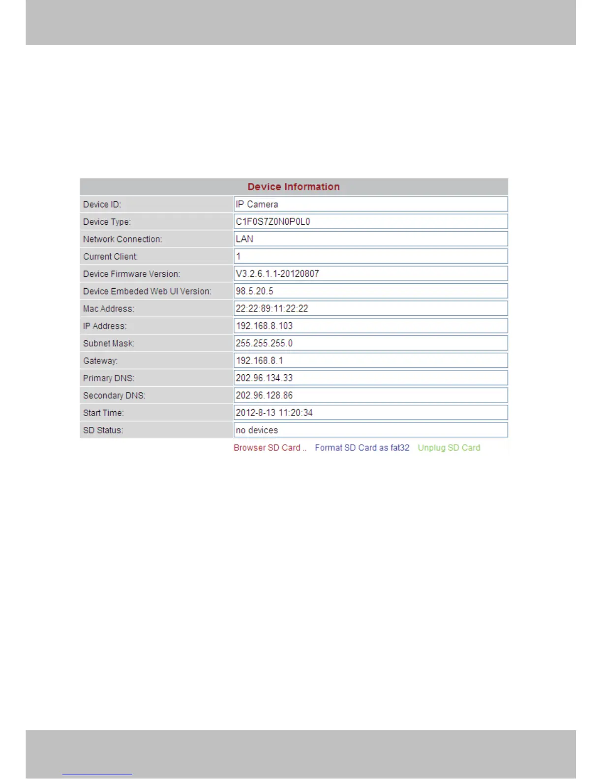 Mac Address: Each camera has its own MAC ID. For example Device ID is 00606E8C5058, the