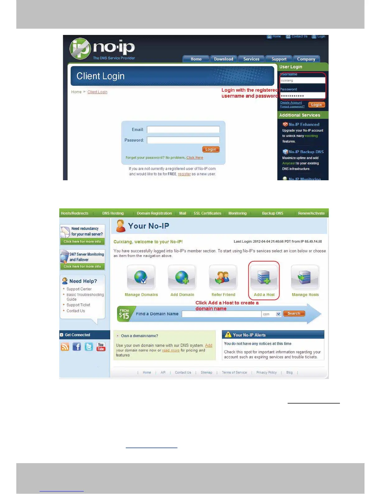 Please create the domain name step by step according to instructions on www.no-ip.com