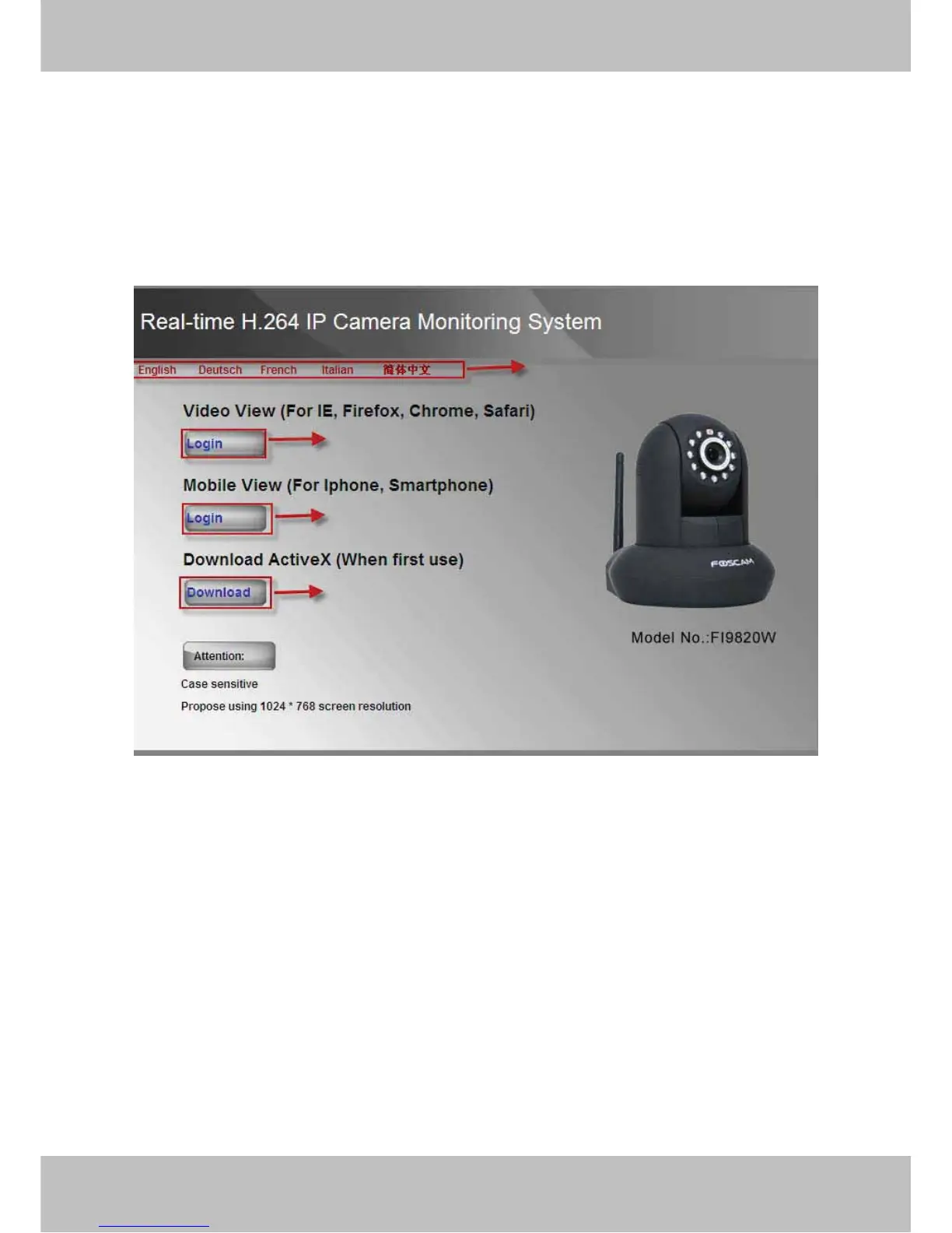 FOSCAM camera supports up to 5 languages, such as English, Deutsch,French and so on. You