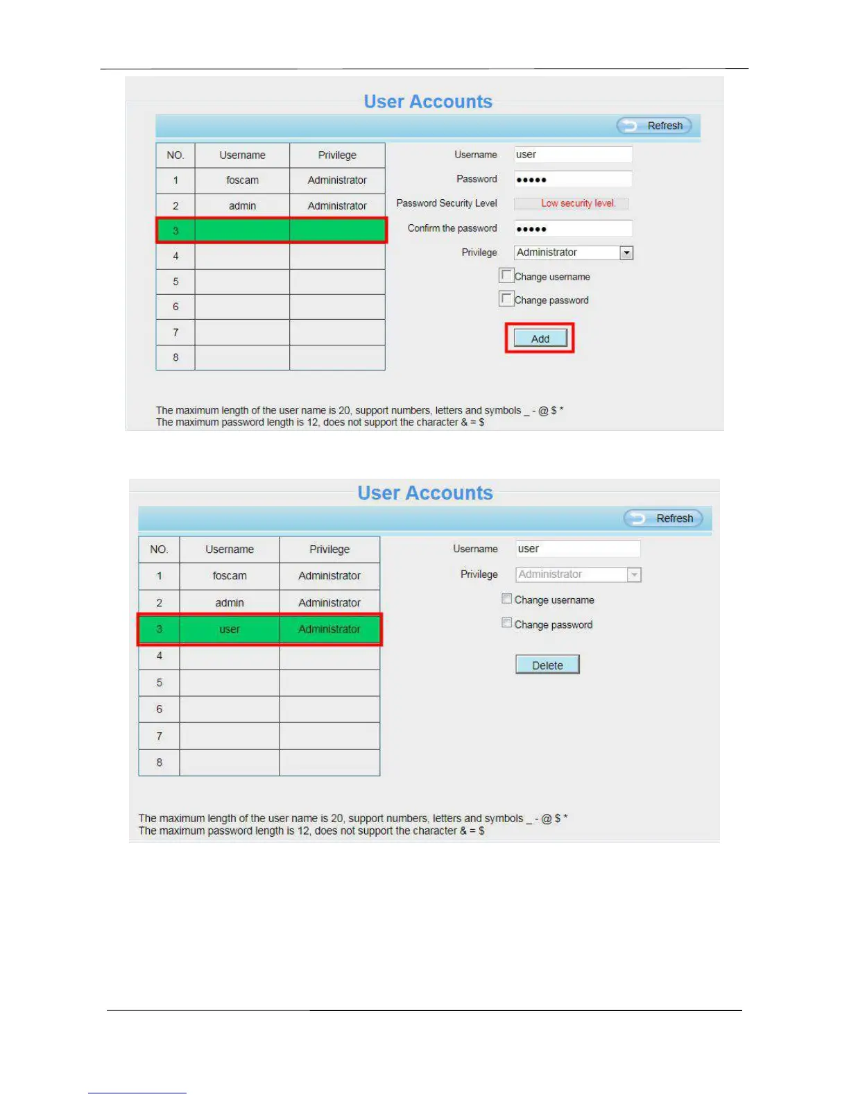 NOTE: The default admin account cannot be deleted, but you can add other administrator users.