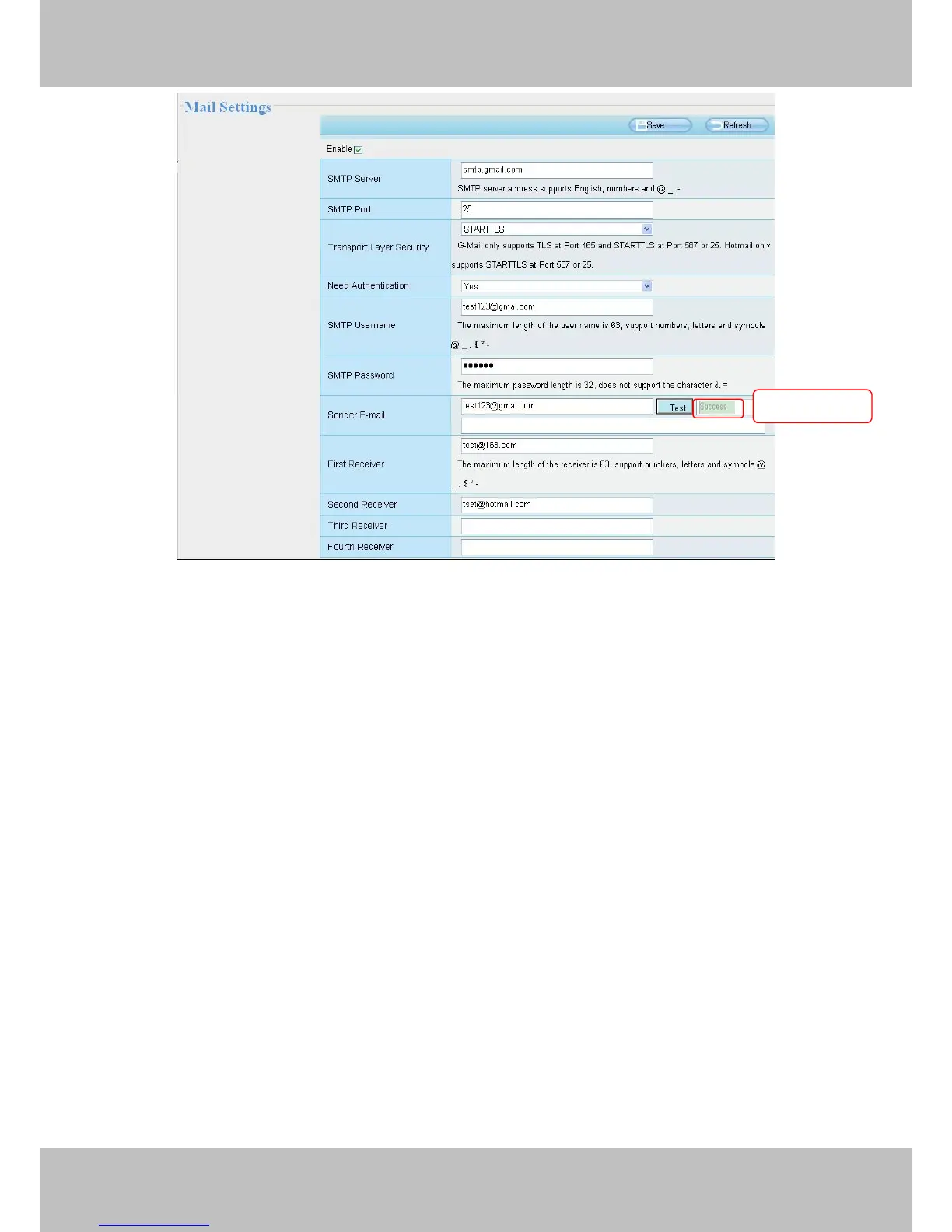 If the test success, you can see the Success behind the Test, at the same time the receivers will receive a test