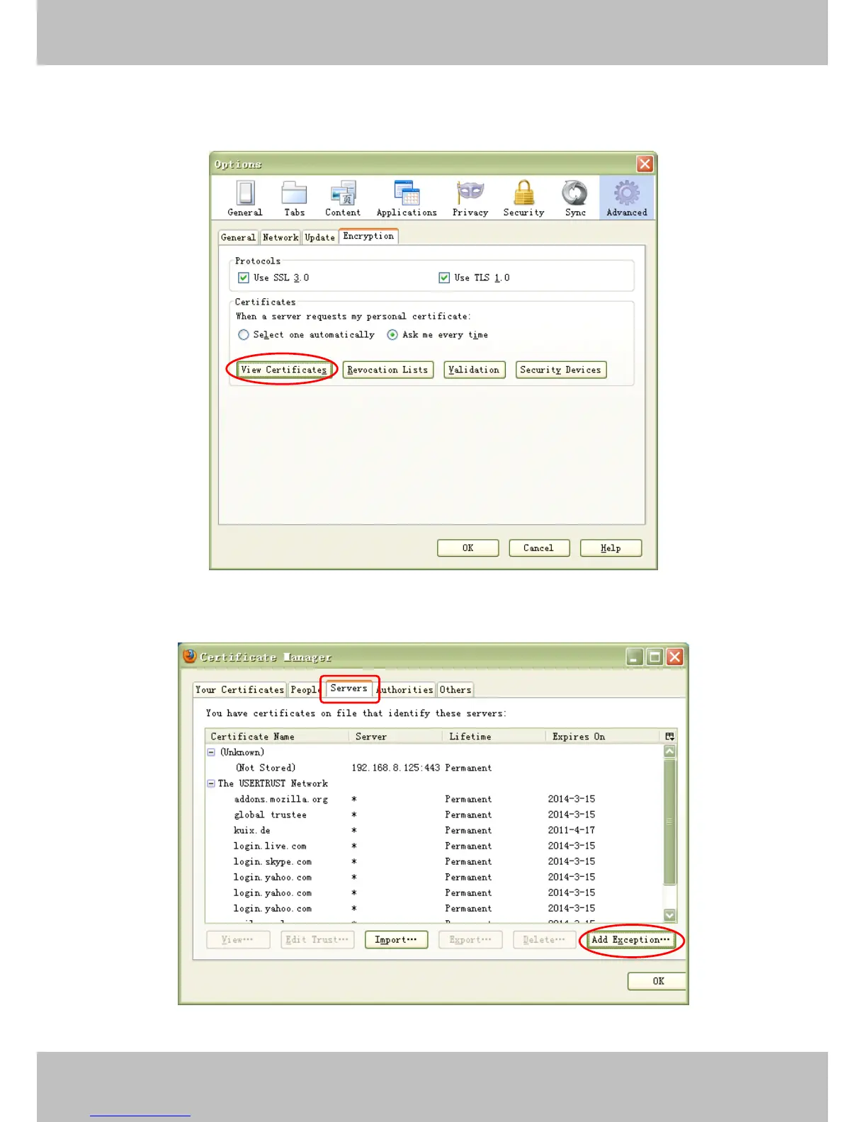 Firefox, you can add the trusted as the following way: