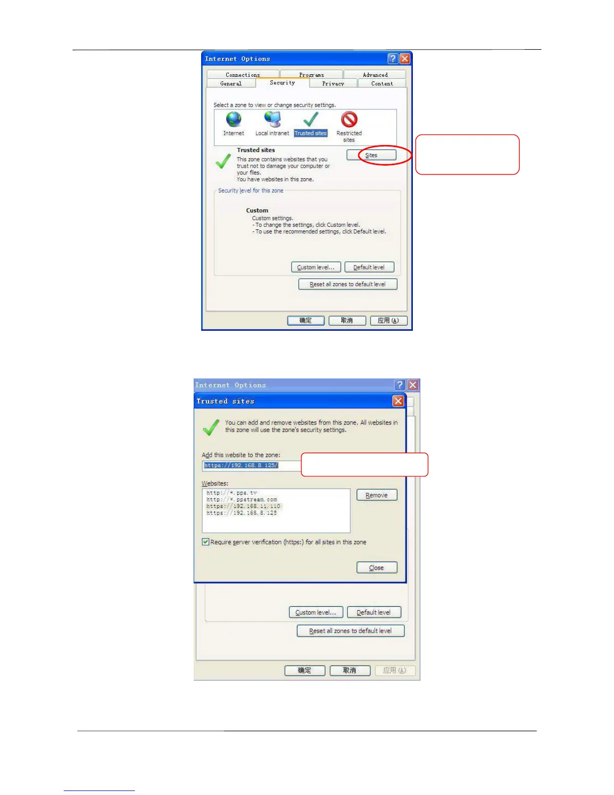 Click Sites then you can add the camera’s https web site to the internet explorer.