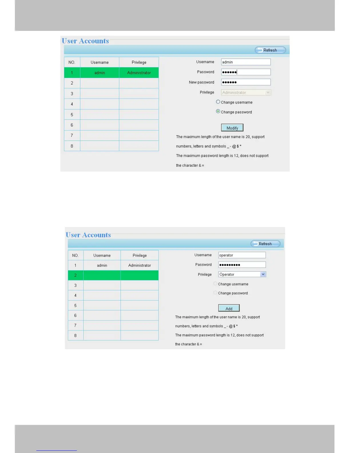 Select one blank column, then enter the new user name, password and privilege, last click Add to take effect.