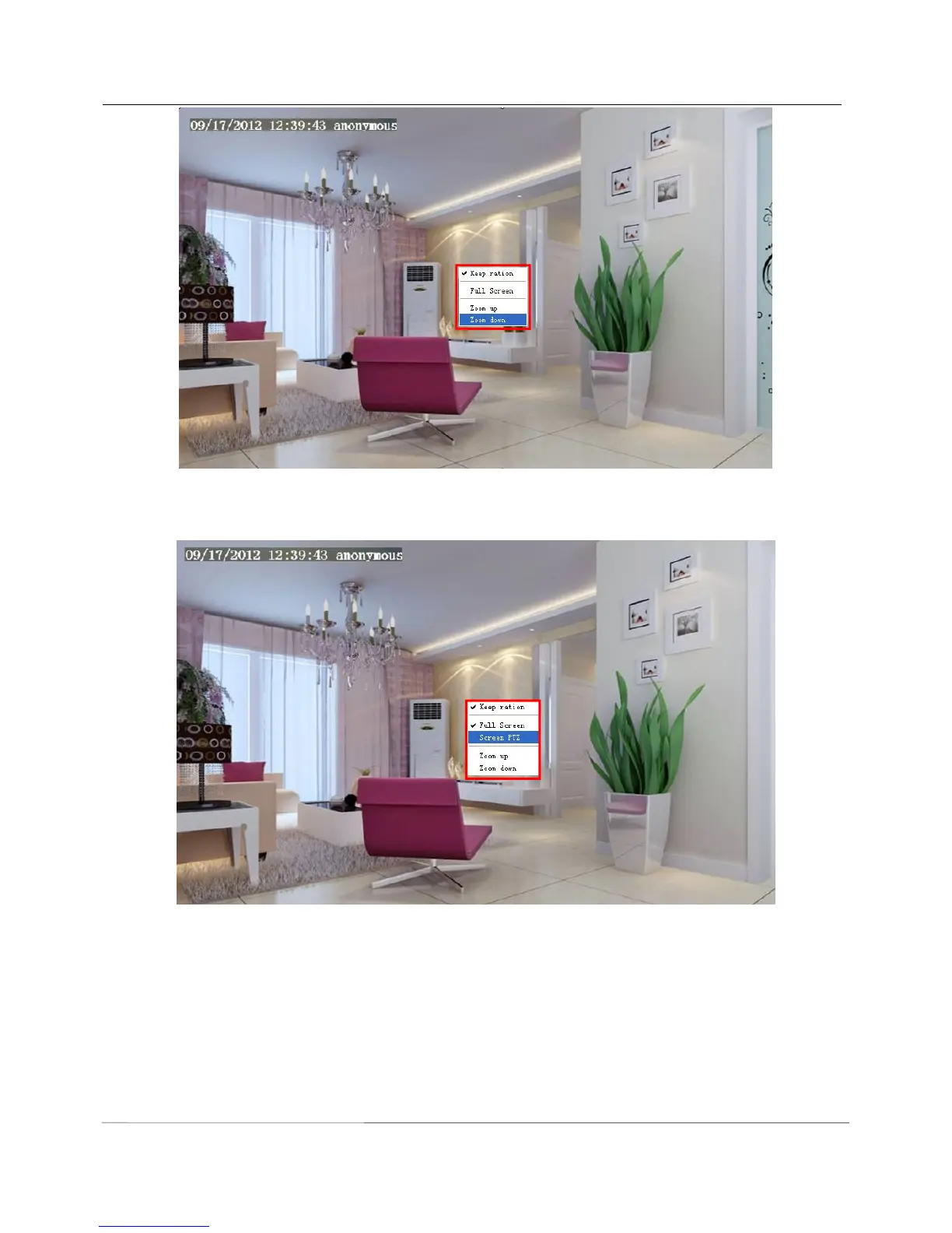 Click the Screen PTZ button and put the mouse on the screen to indicate the camera move direction you