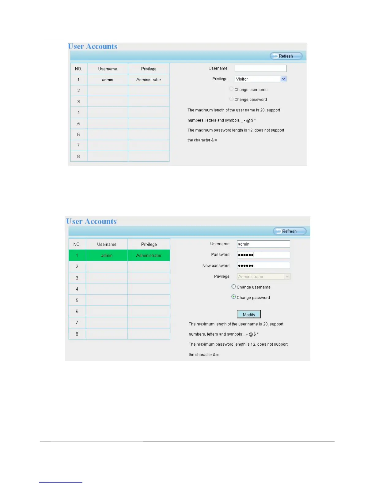 Select one blank column, then enter the new user name, password and privilege, last click Add to take effect.