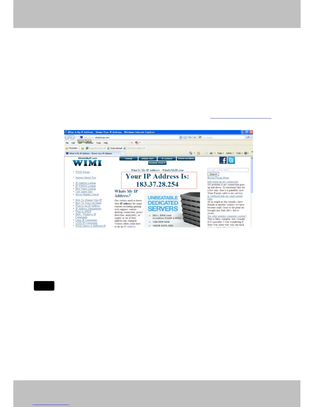 To obtain your WAN IP address, enter the following URL in your browser: http://www.whatismyip.com.The