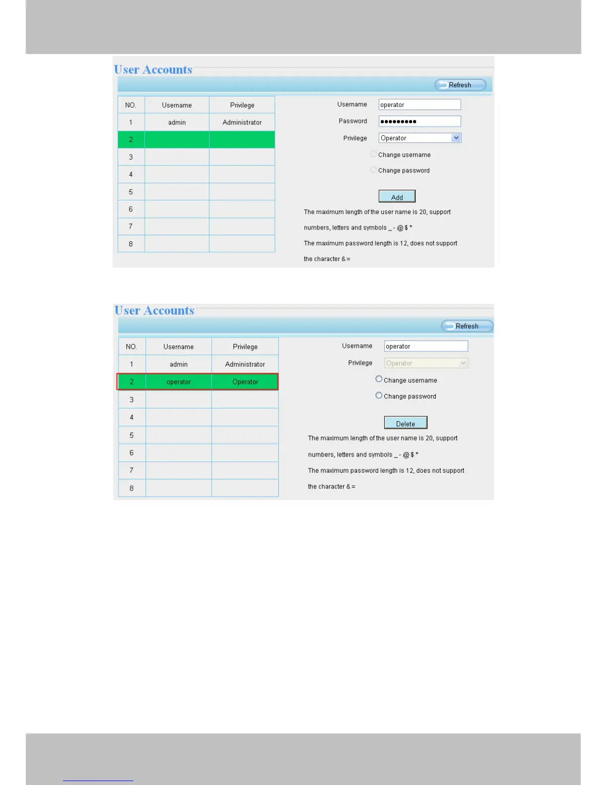 Delete :Select the account which you want to delete, then click Delete button to take effect.