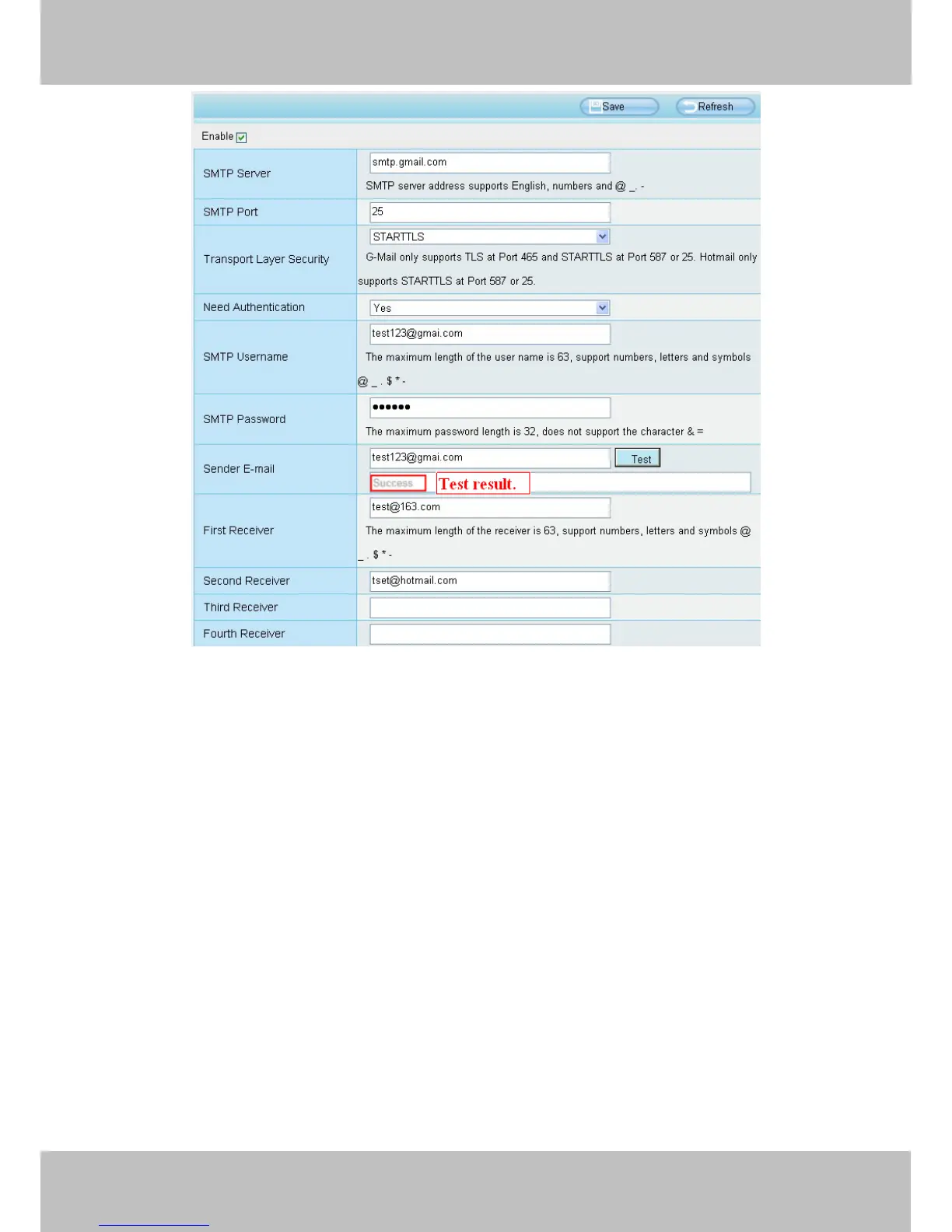If the test success, you can see the Success behind the Test, at the same time the receivers will receive a test