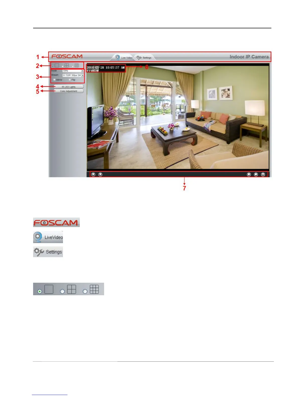 Section1 FOSCAM Logo/ LiveVideo / Settings buttons