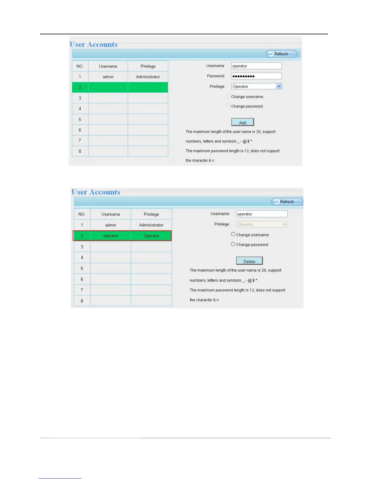 Delete : Select the account which you want to delete, then click Delete button to take effect.