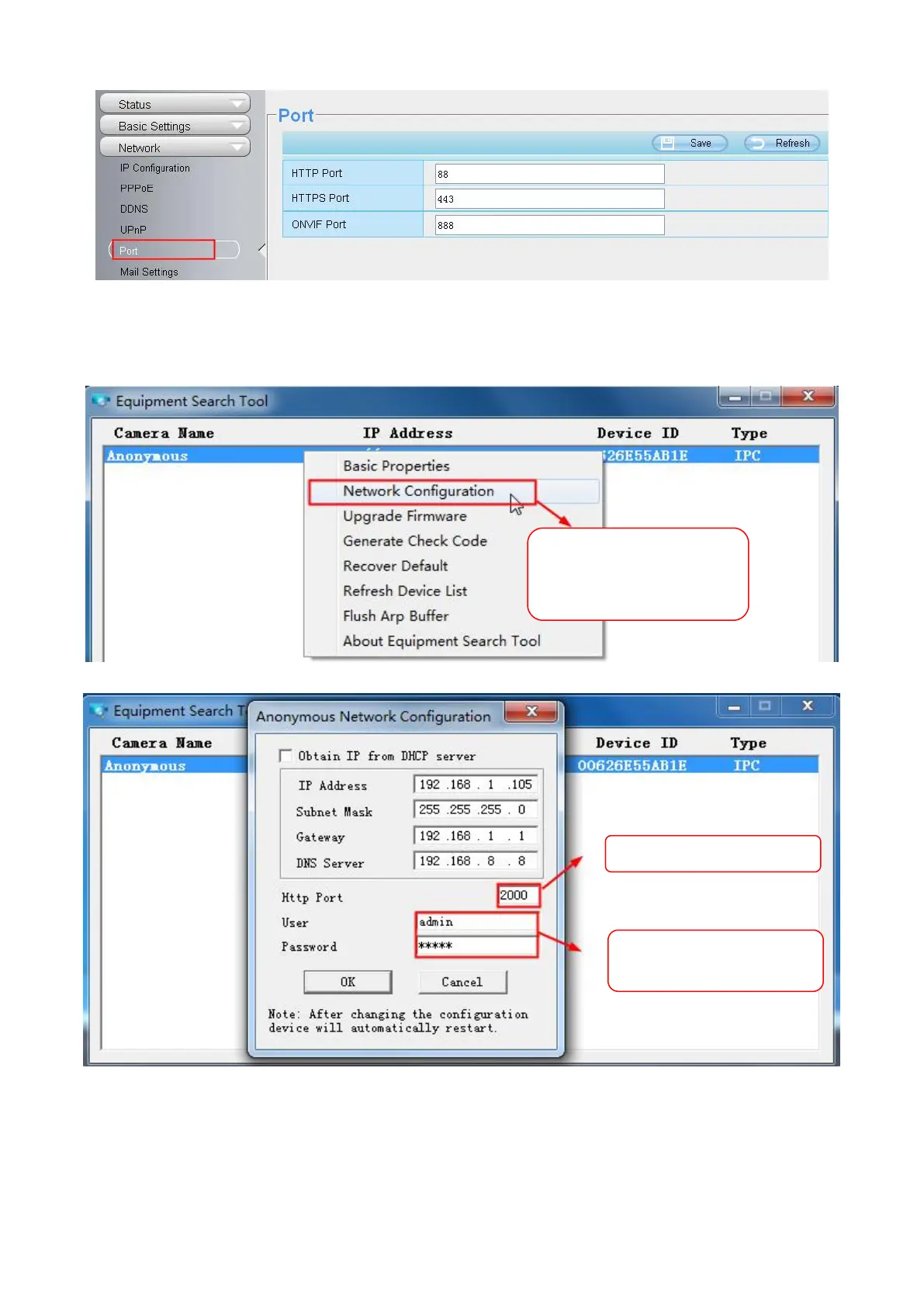 was changed to 2000, so we see http://192.168.1.105:2000 in Equipment Search Tool. Also, the LAN IP