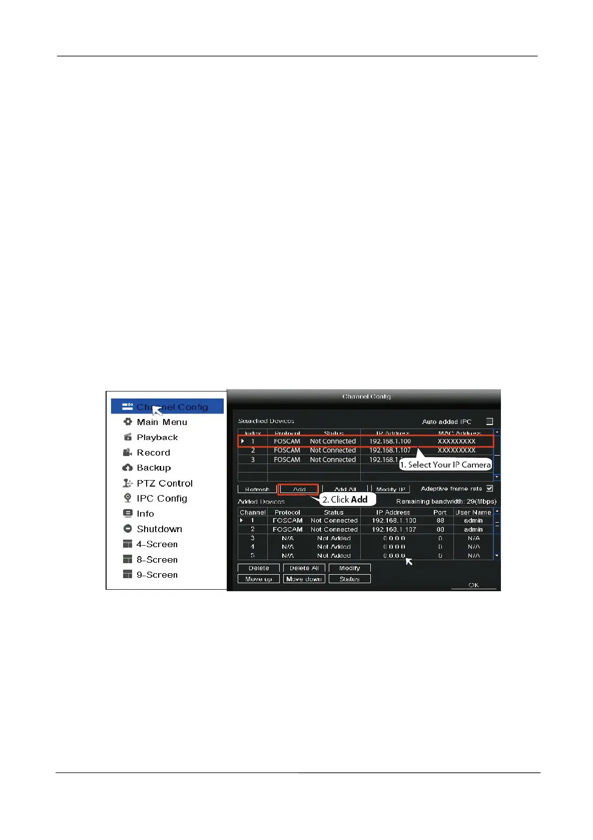 Address, Add IP Camera, Modify IP, Delete/Modify/move up/move down added device.