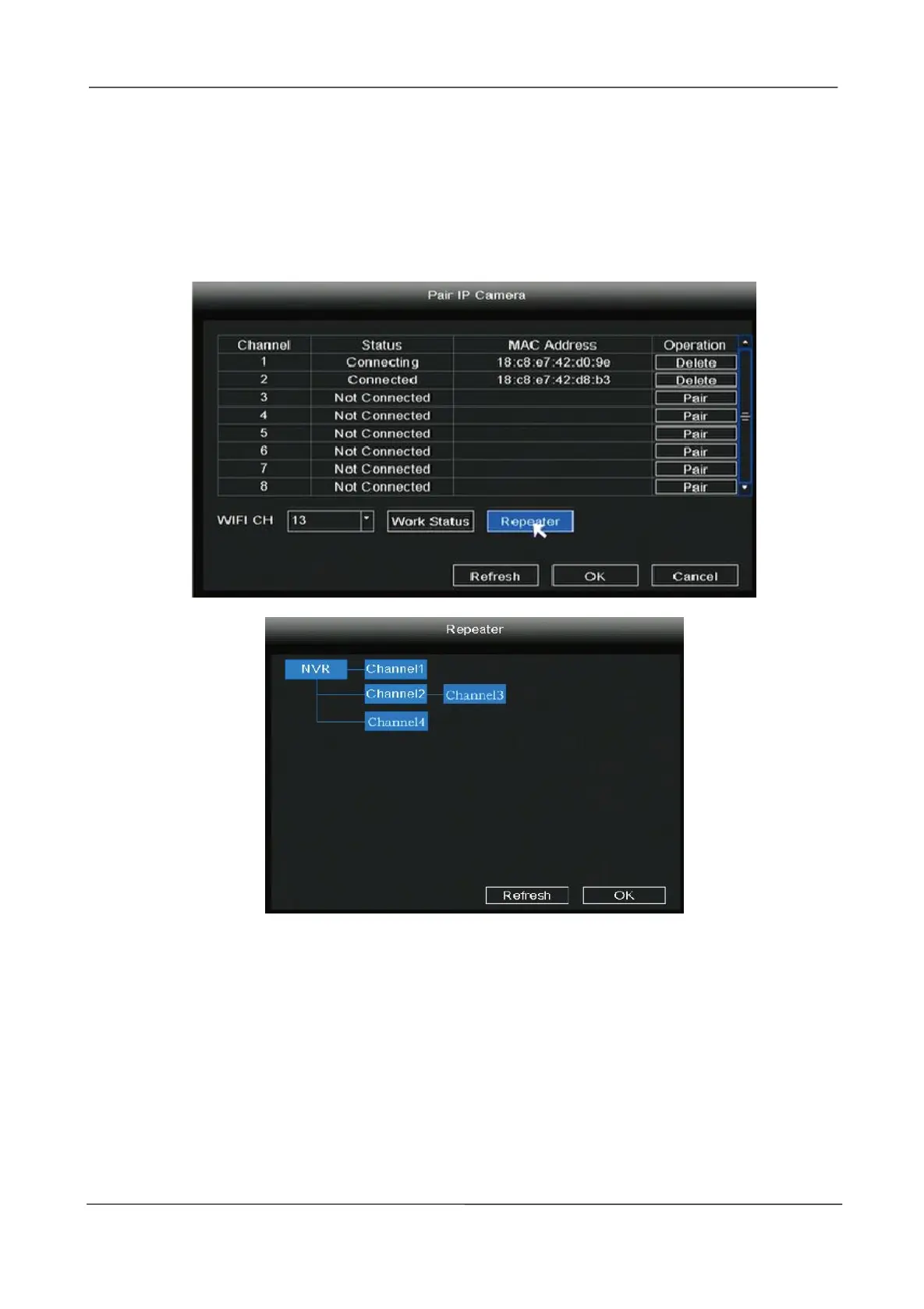 Right-click in live view mode to enter the Pair IP Camera interface, click Repeater button.Then,