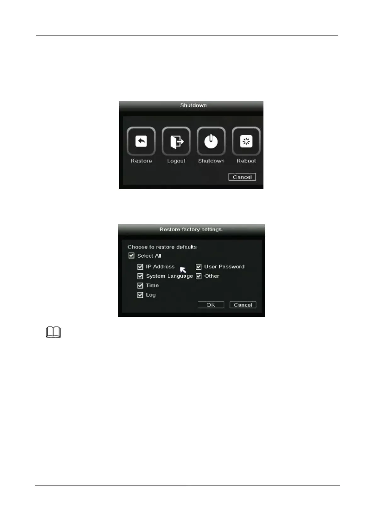 Right-click in live view mode select Shutdown to enter the Shutdown interface. You can restore,