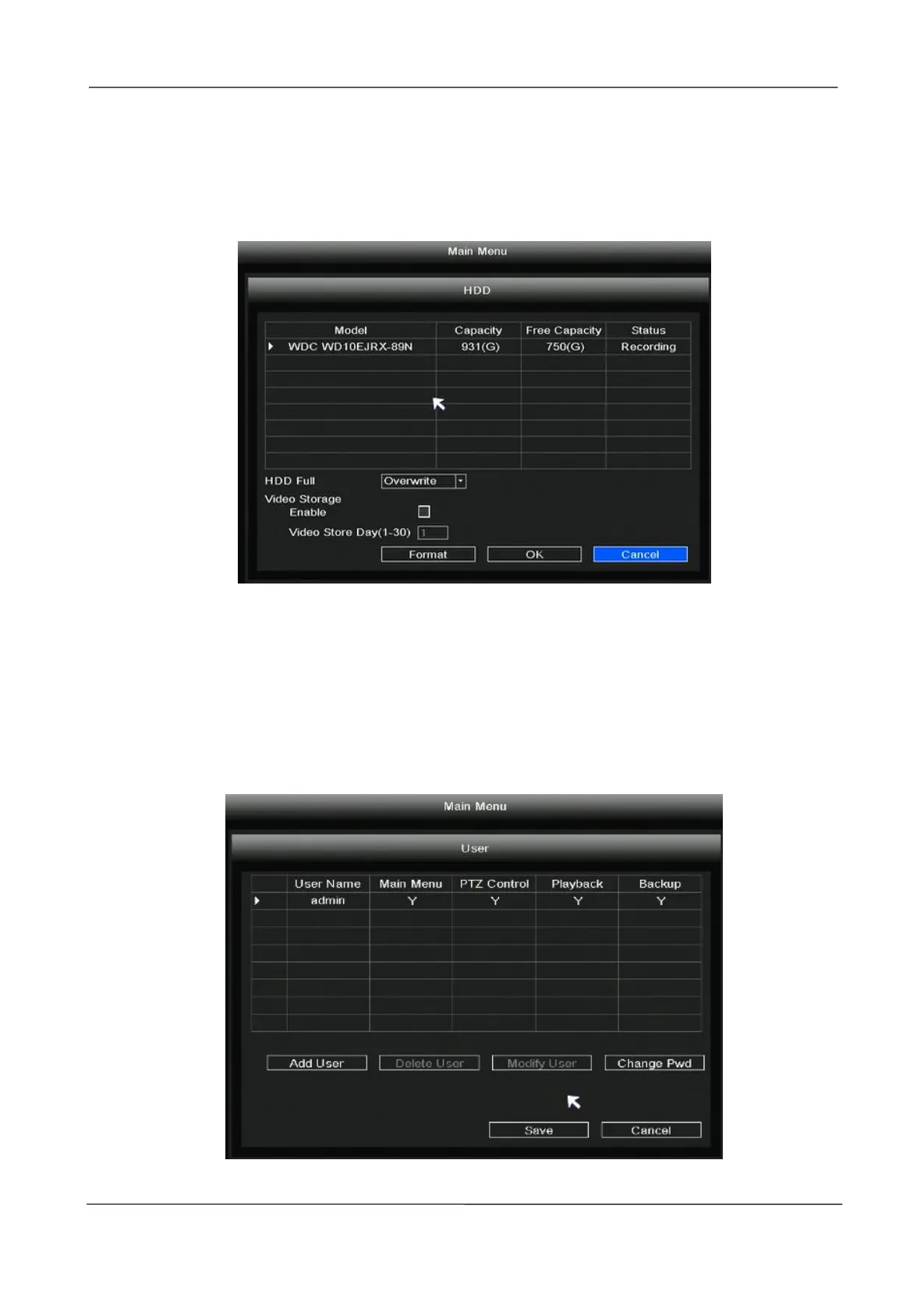 Right-click in live view mode and select “Main Menu > User” in the Main Menu interface. The User