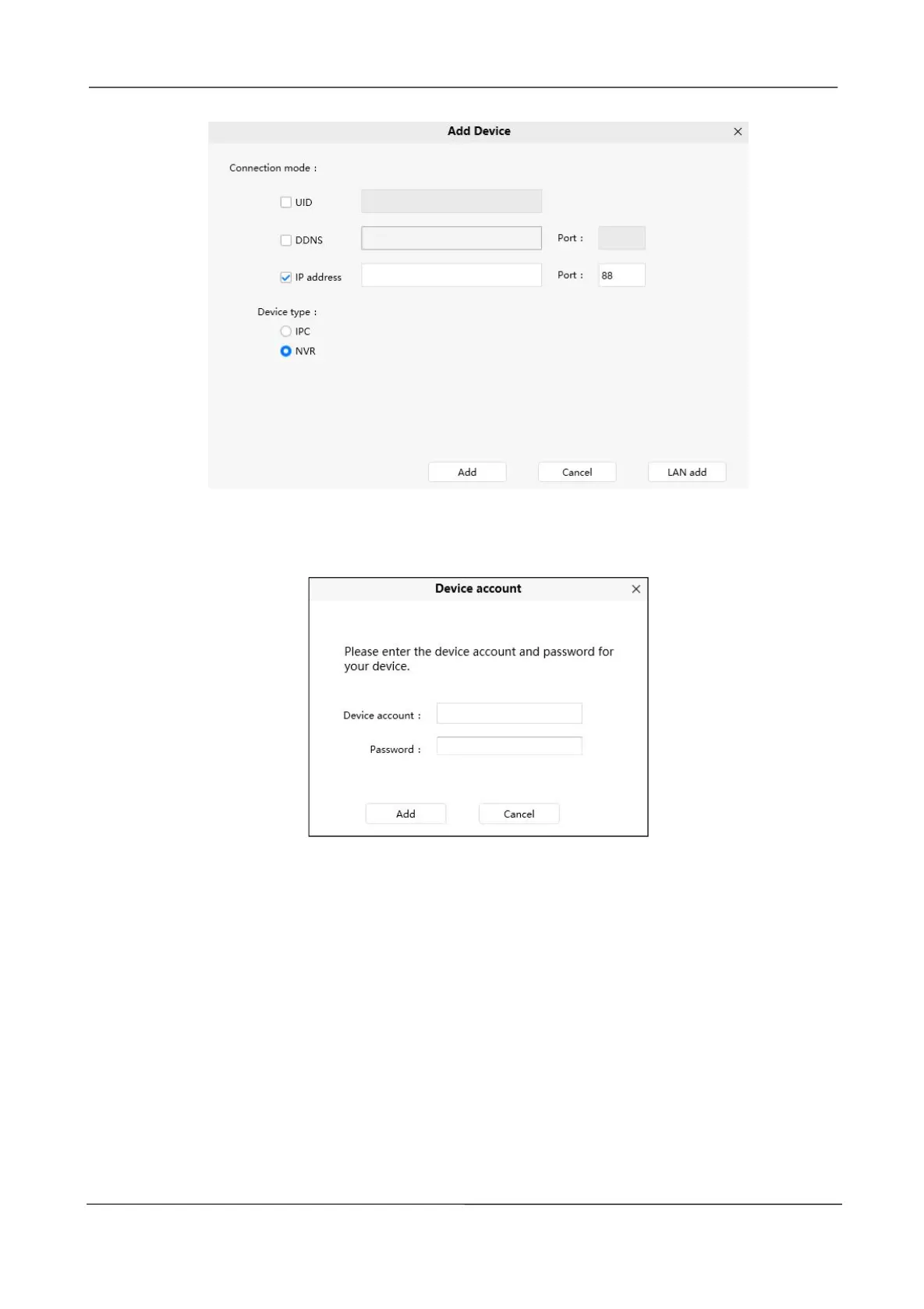 Step 4 Enter Device account and Password of the NVR.