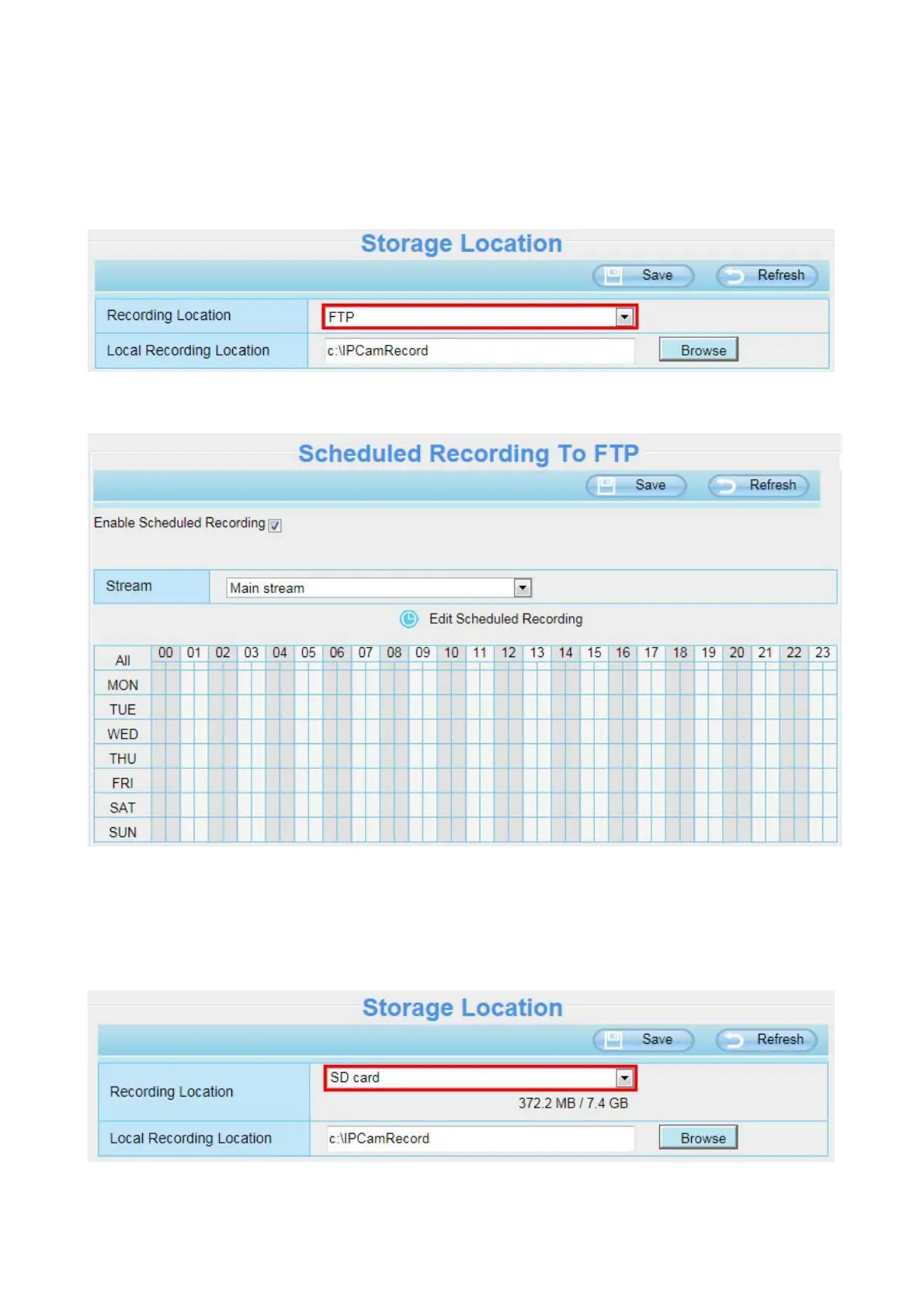 When the parameter Recording Location is set SD Card on the Storage Location page, you can