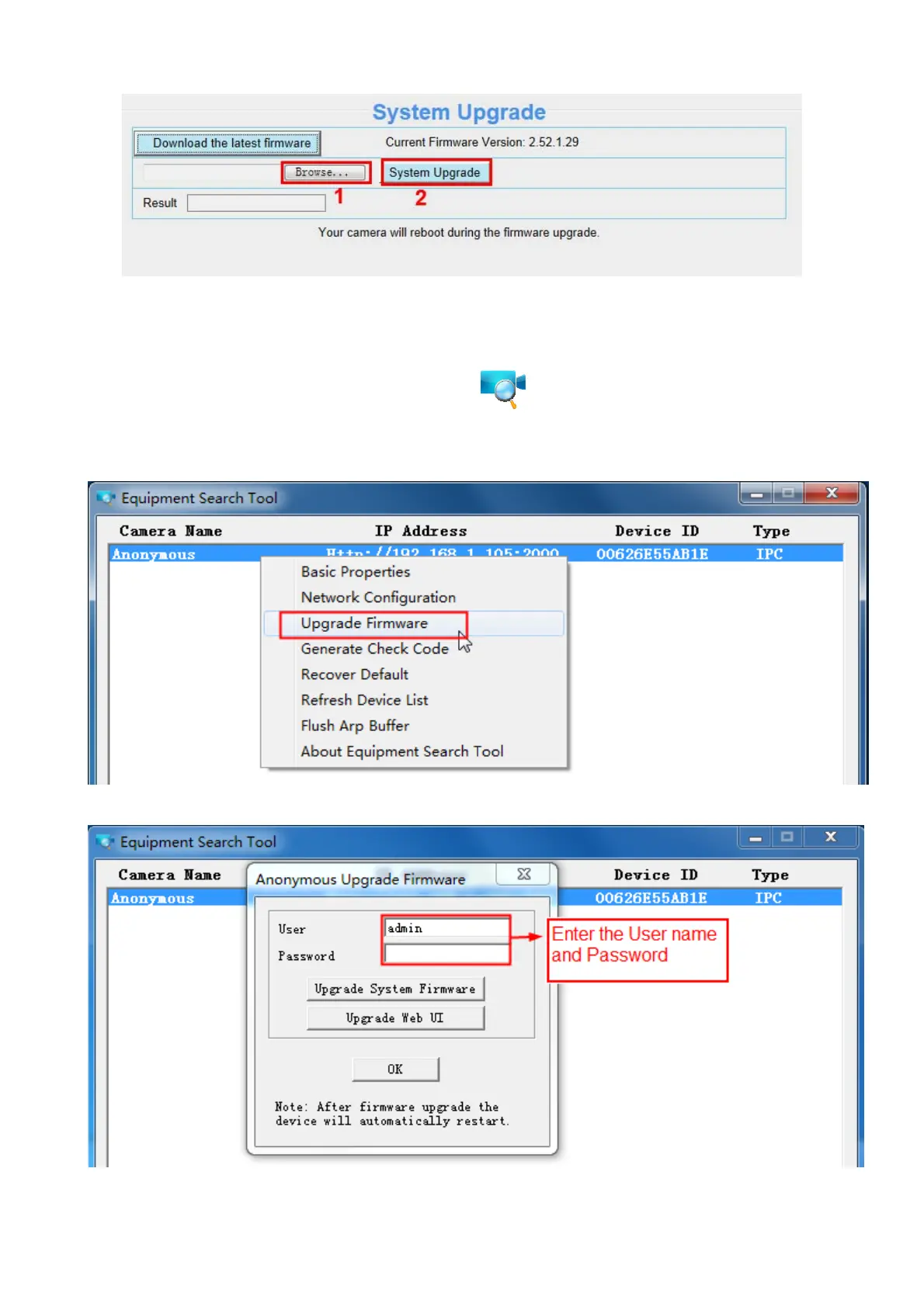 upgrade the firmware. Then select Upgrade Firmware and enter the username and password, choose