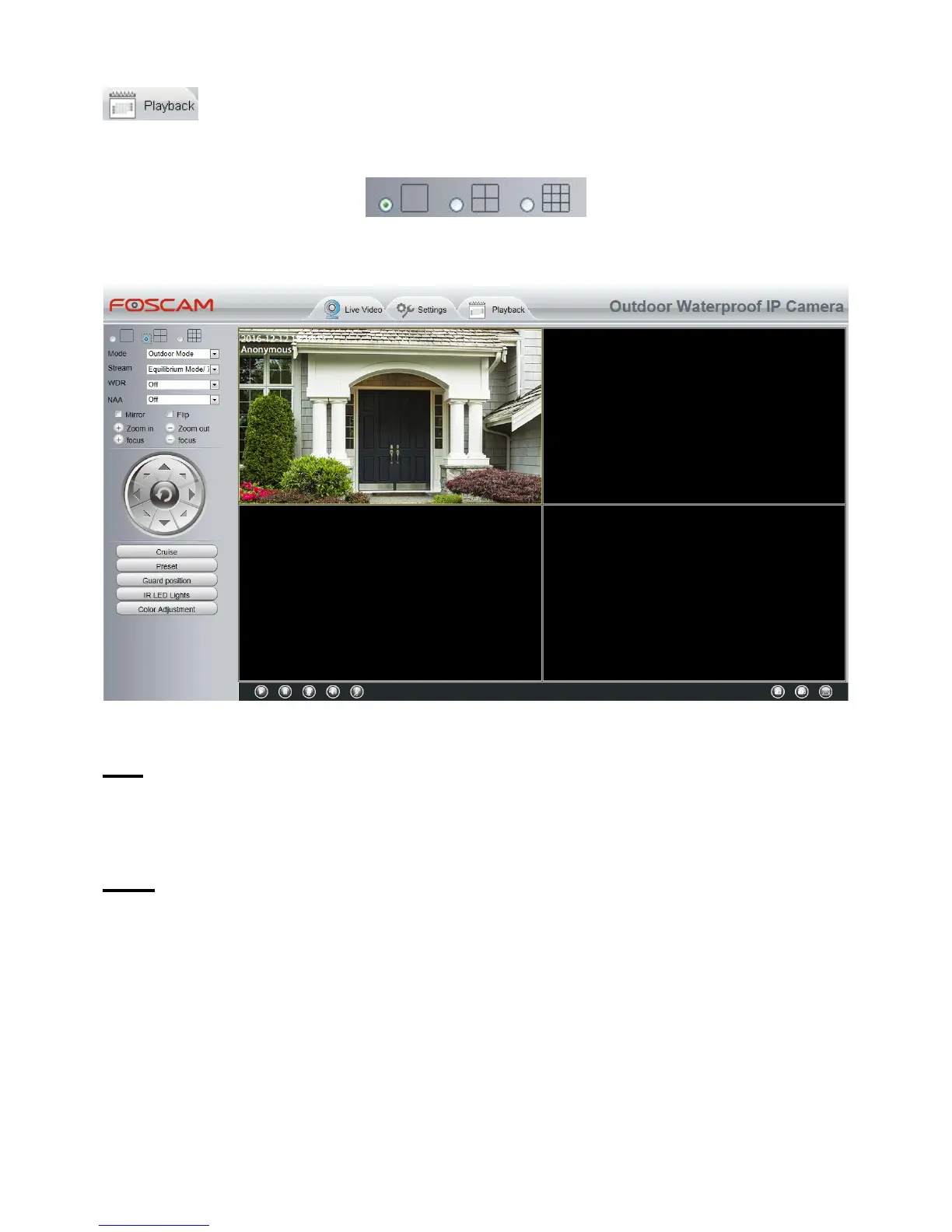 Section 3 Mode / Stream / WDR / NAA / Mirror / Flip / Zoom / Focus Buttons