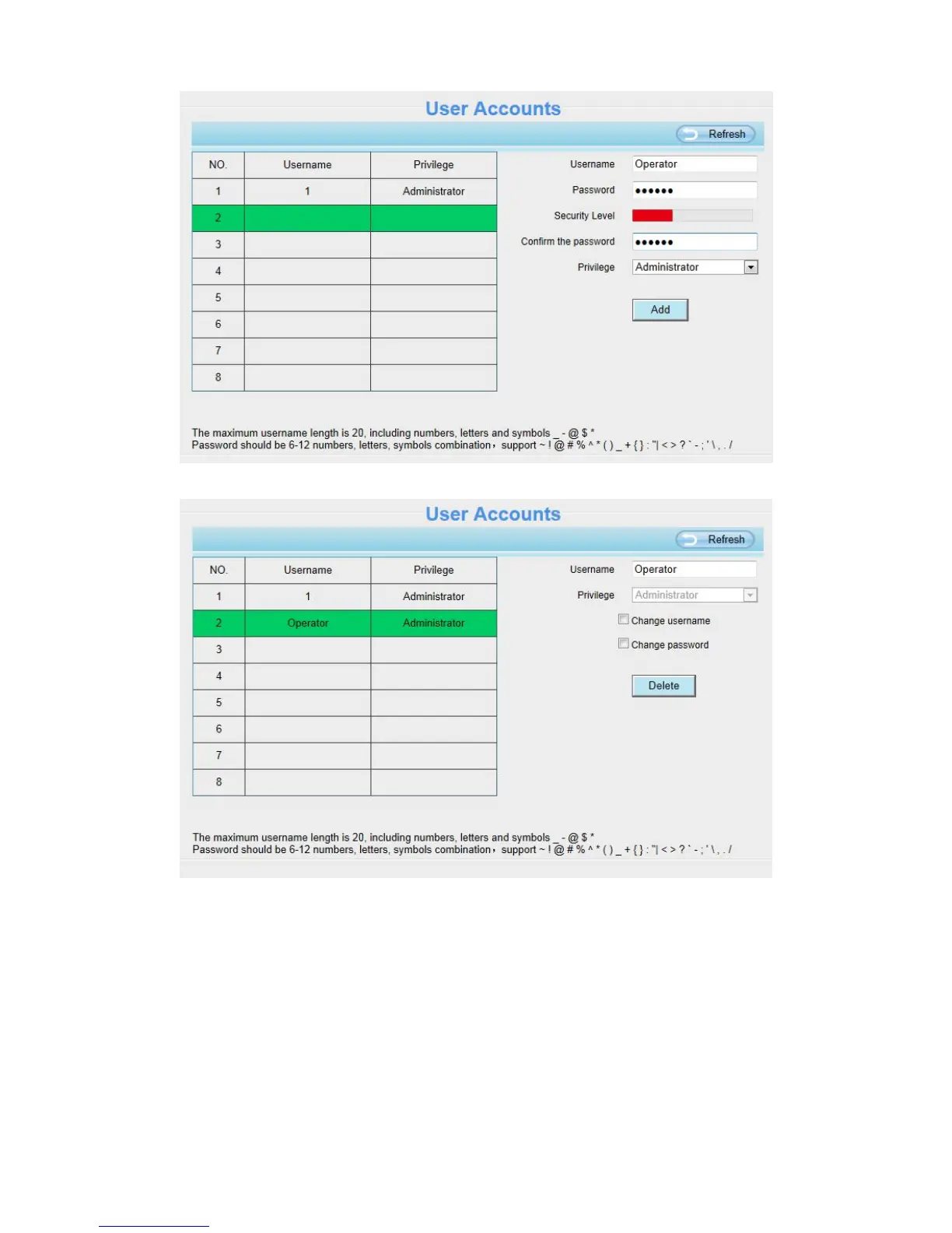 Delete: Select the account which you want to delete, then click Delete button to take effect.