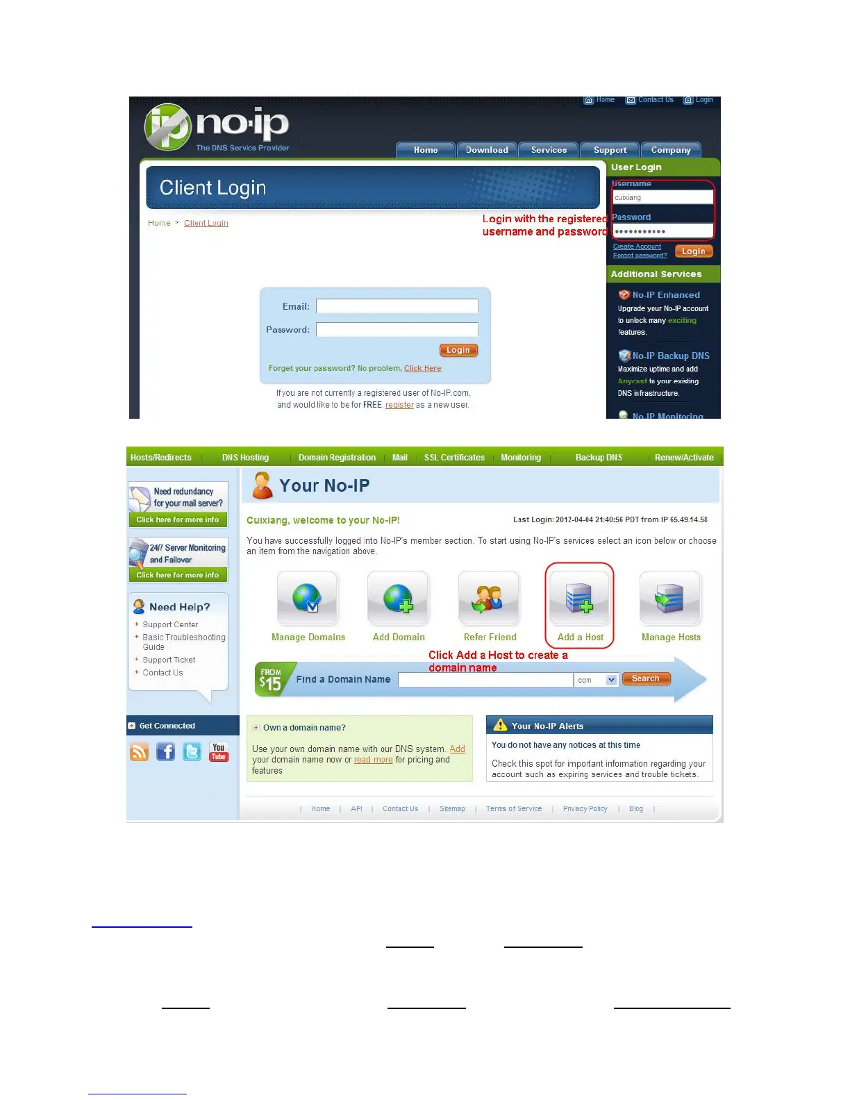 Please create the domain name step by step according to instructions on www.no-ip.com