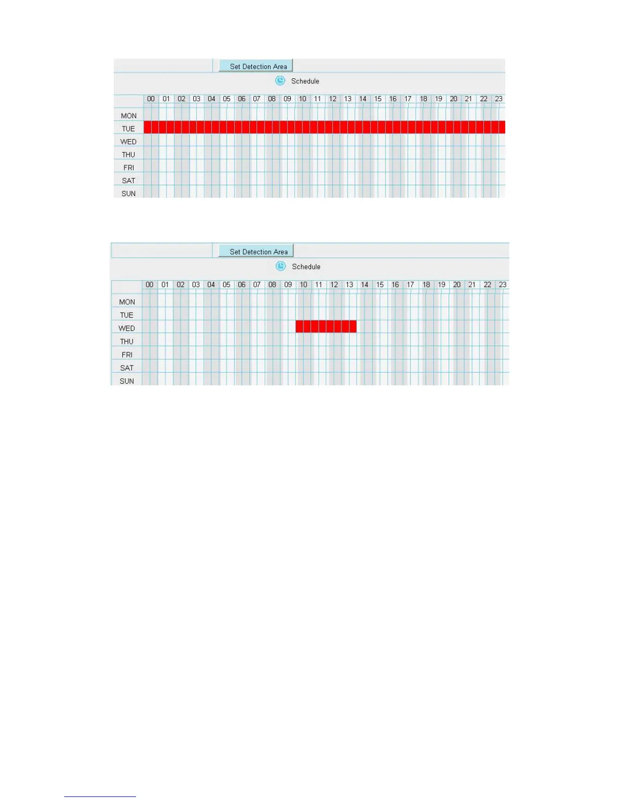 You must set the detection area and detection schedule, or else there is no alarm anywhere and anytime.
